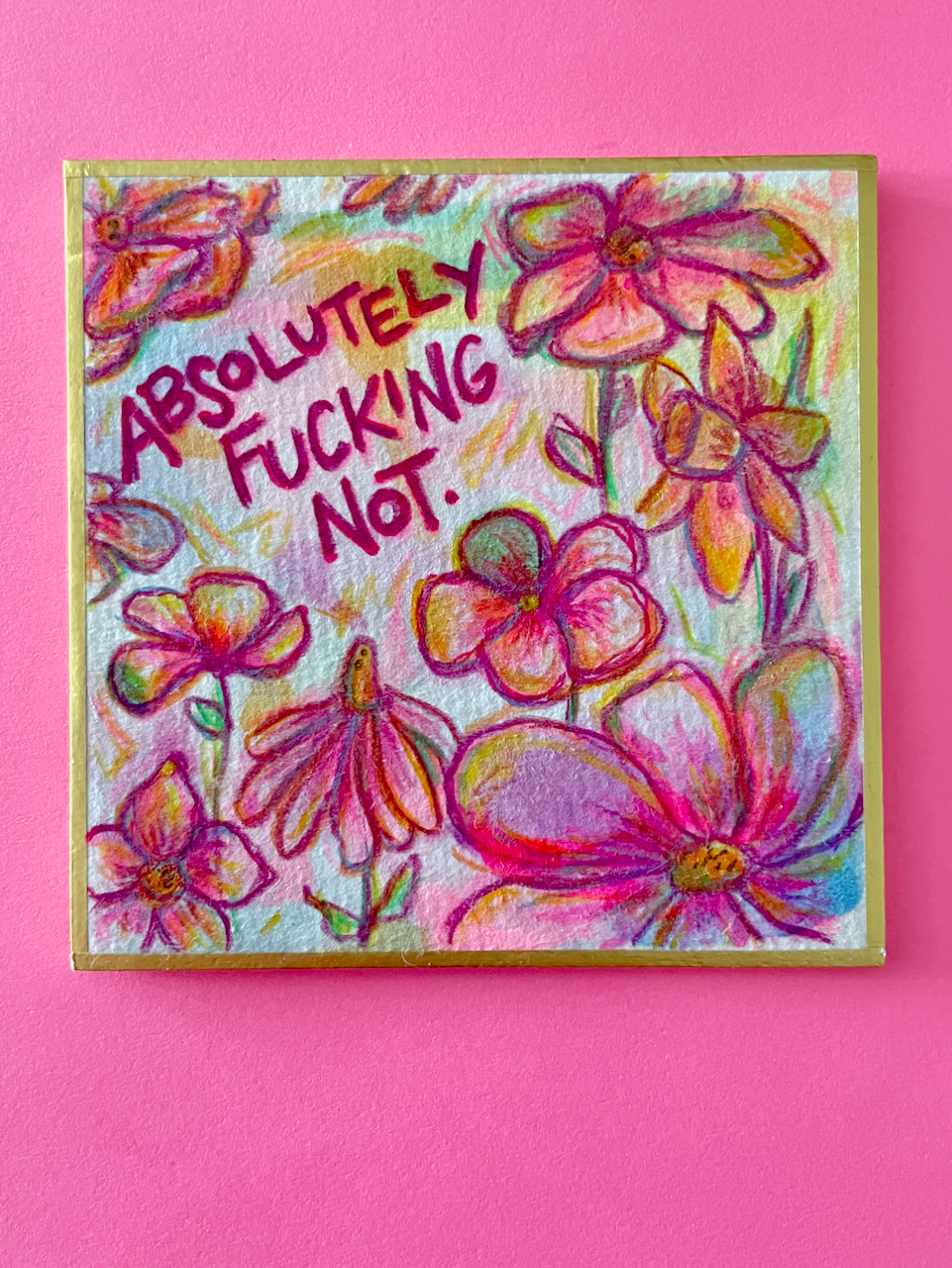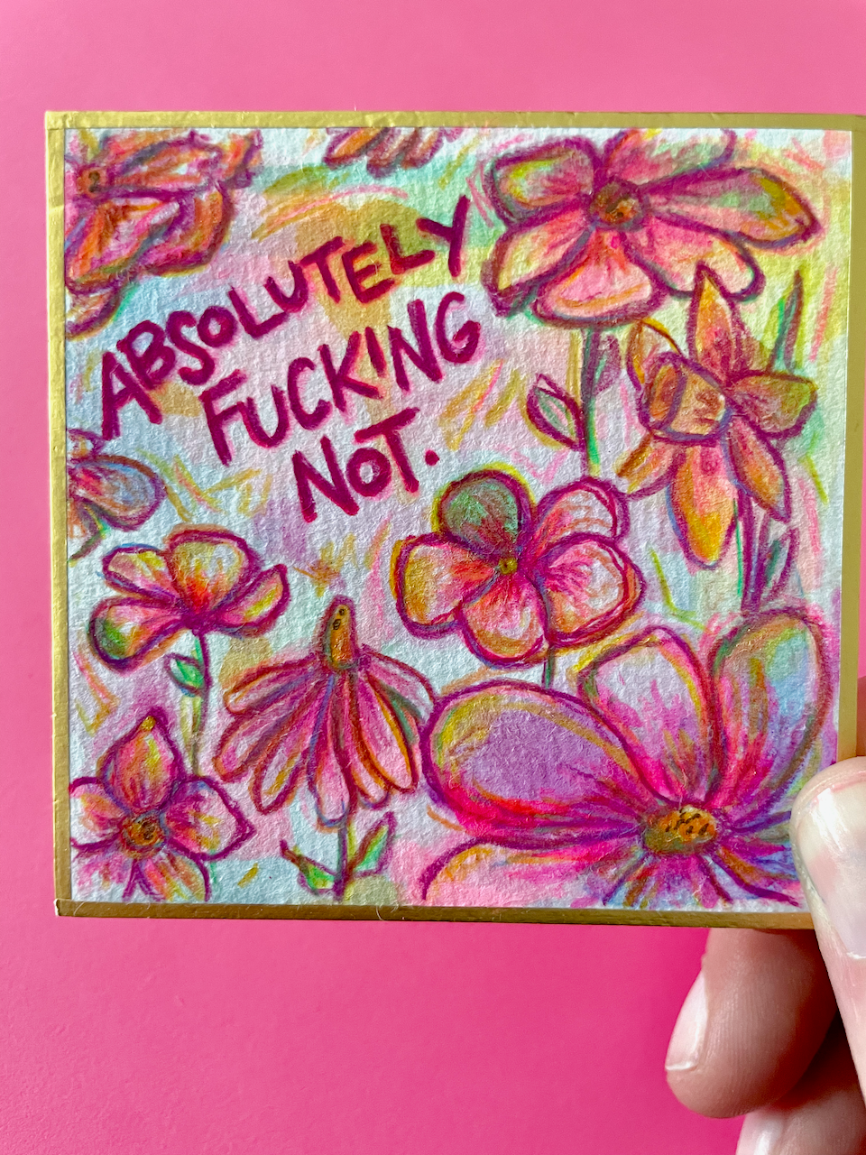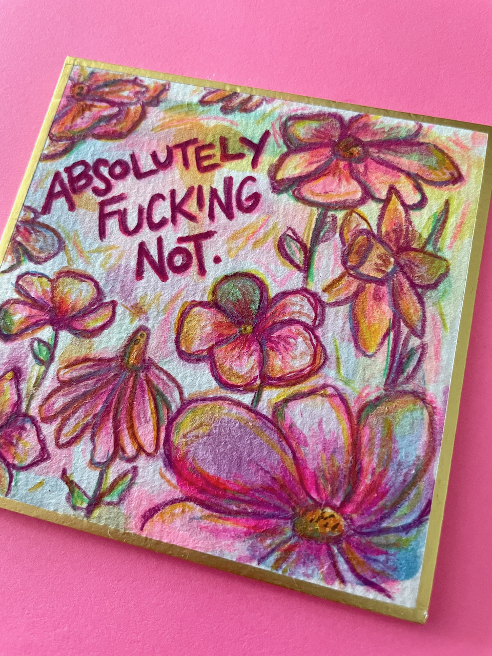 This is a tiny world of color, created with free-flowing watercolor and acrylic backgrounds that feature colored pencil florals and the phrase "Absolutely Fucking Not," an important reminder at times that expresses so much.