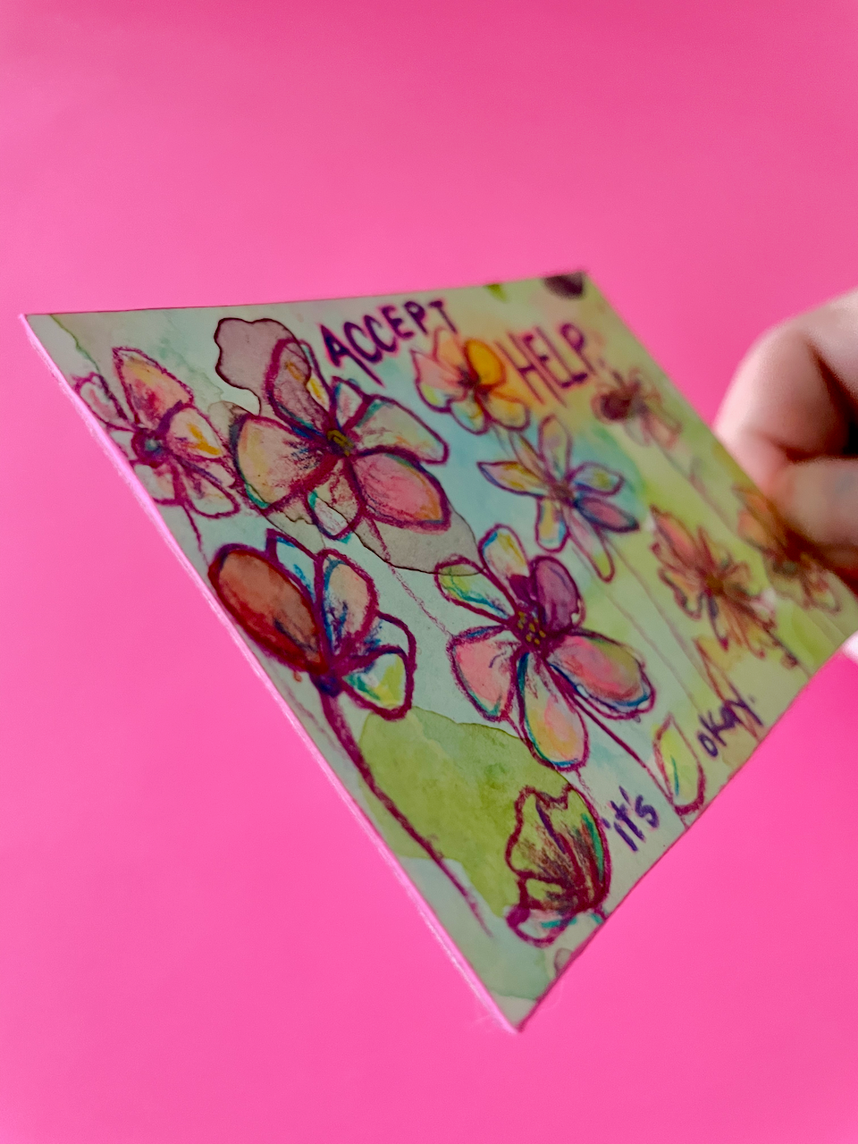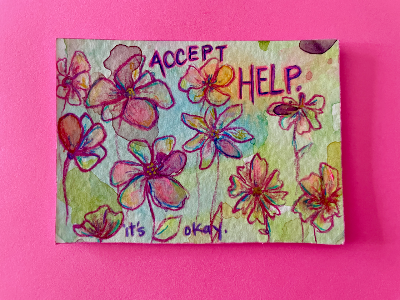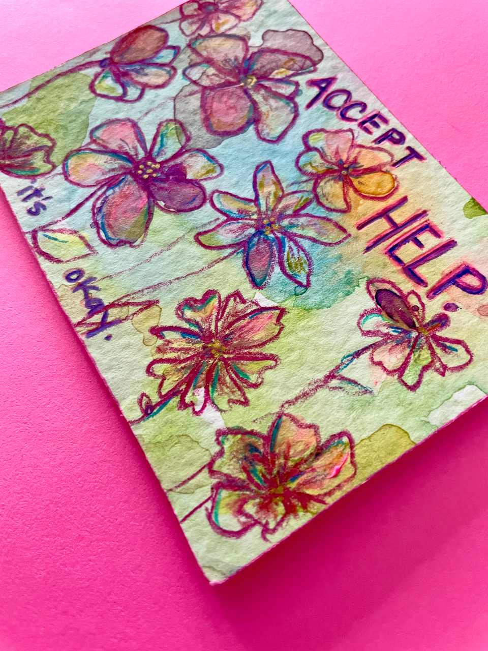 This is a tiny world of color, created with free-flowing watercolor and acrylic backgrounds that feature colored pencil florals and the phrase "Accept Help - It's Okay" -- a reminder to let your community help you, even when it's hard.