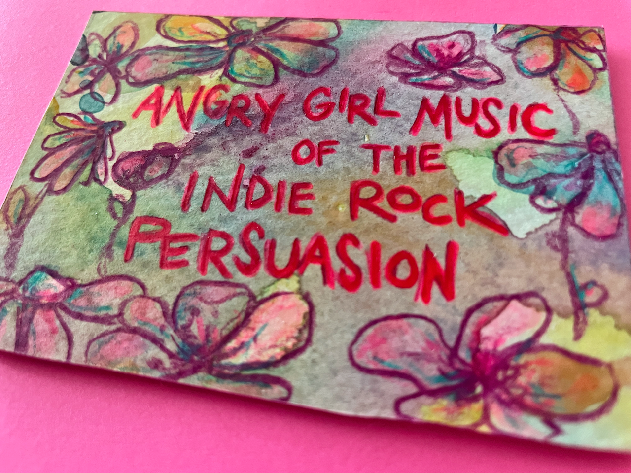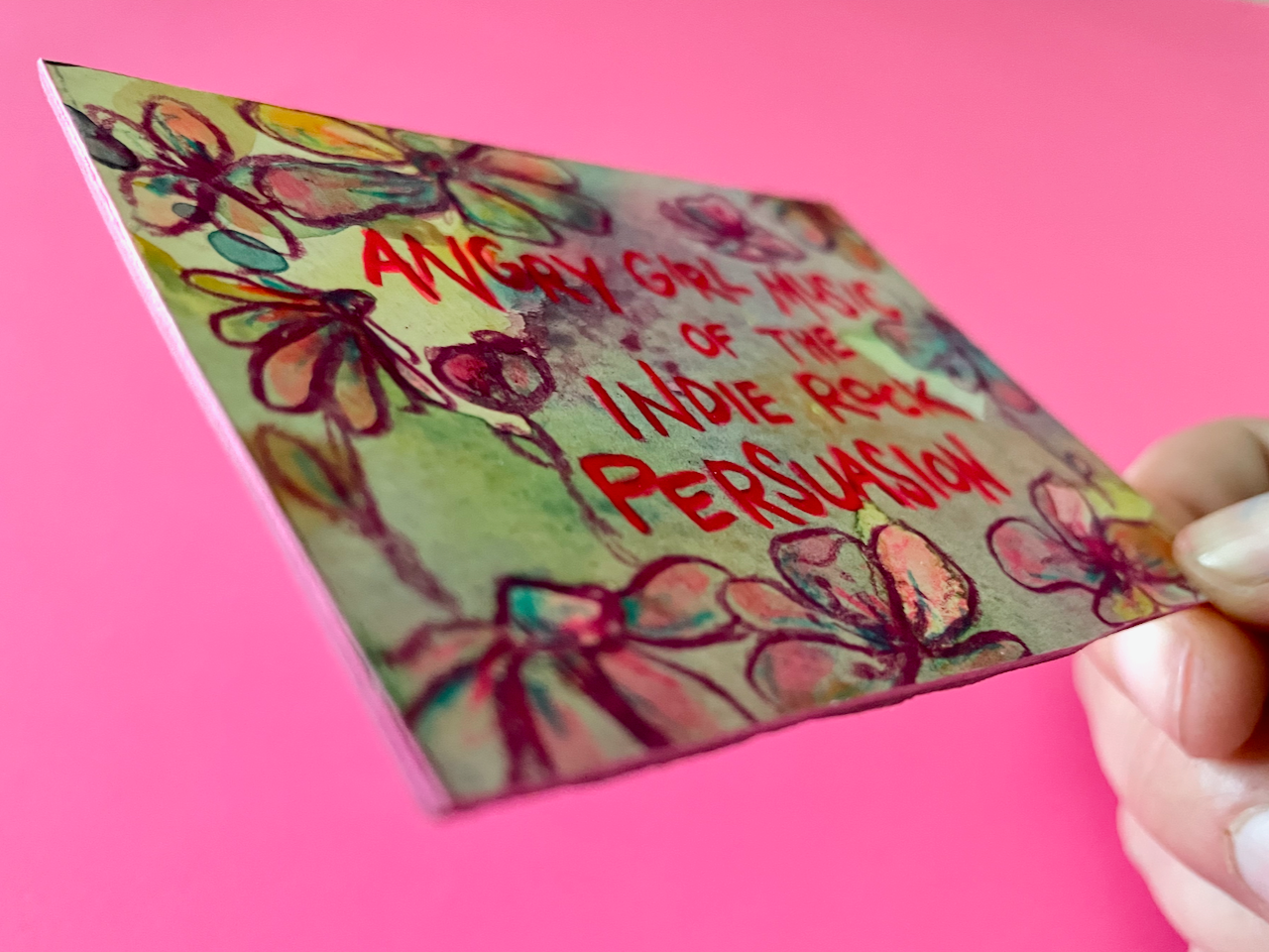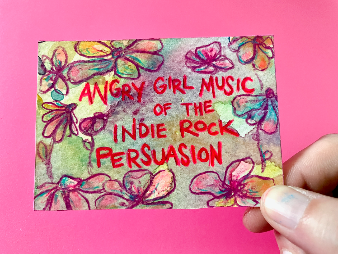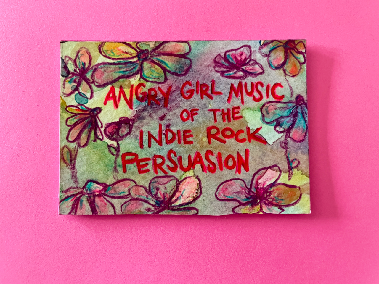 This is a tiny world of color, created with free-flowing watercolor and acrylic backgrounds that feature colored pencil florals and the phrase "Angry Girl Music of the Indie Rock Persuasion" -- a reference to our favorite high school feminist badass, Kat Stratford from 10 Things I Hate About You.