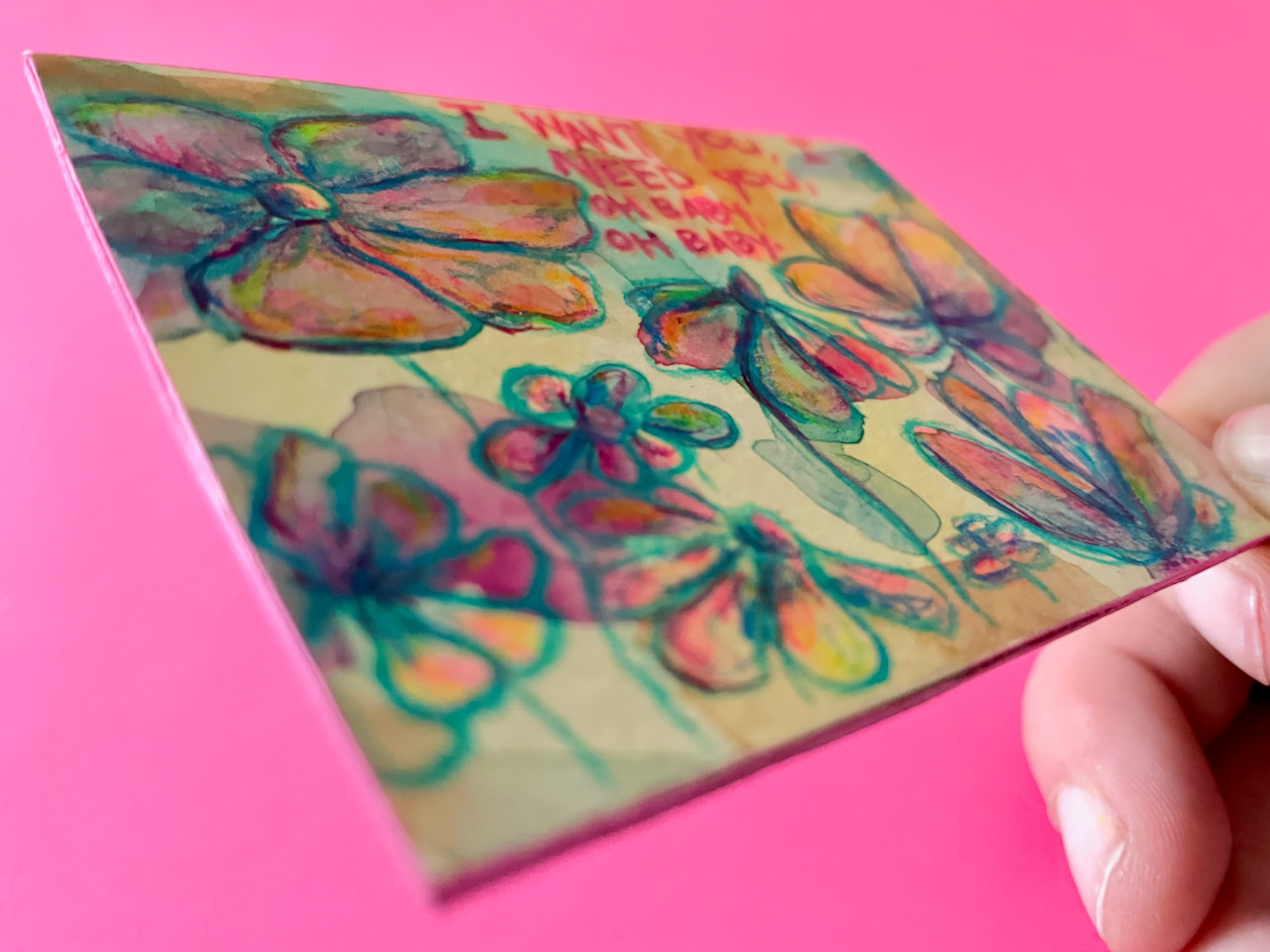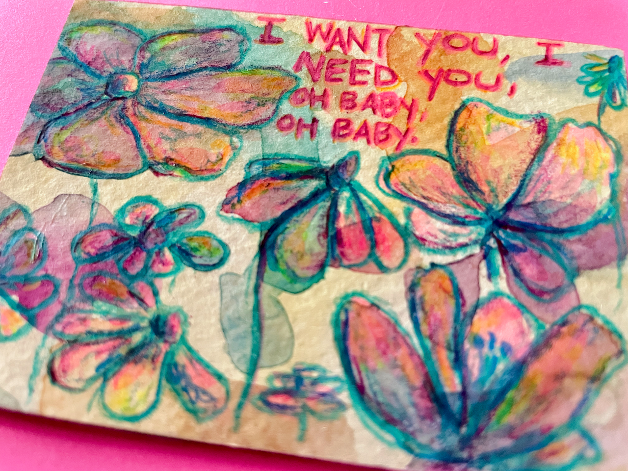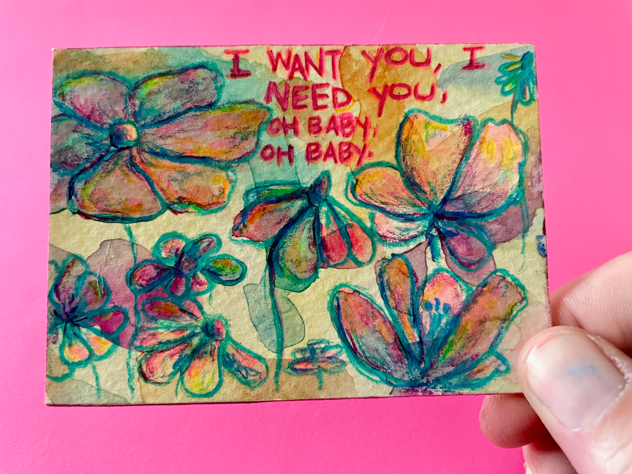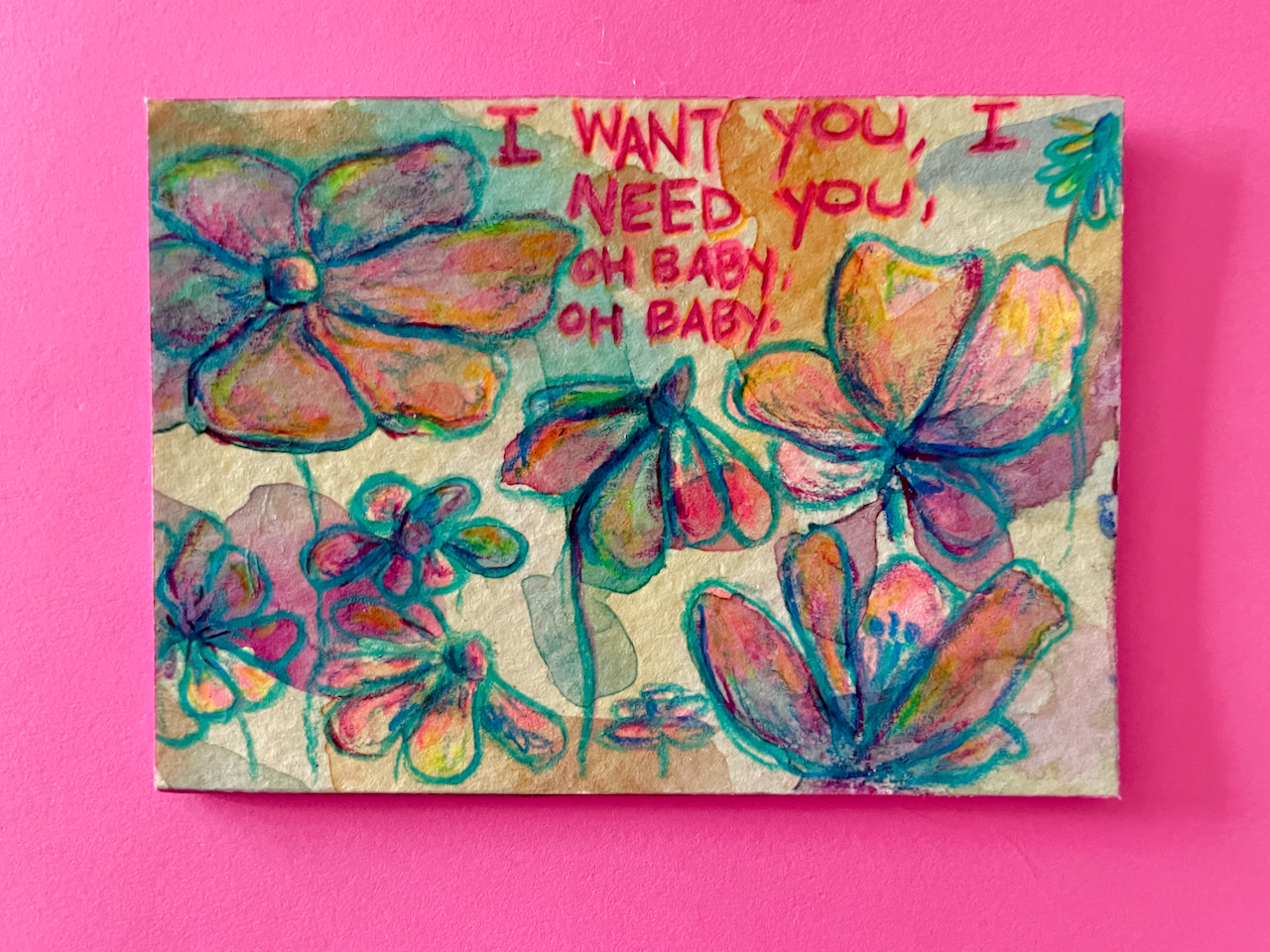 This is a tiny world of color, created with free-flowing watercolor and acrylic backgrounds that feature colored pencil florals and the phrase "I Want You, I Need You, Oh Baby, Oh Baby" -- a reference to our favorite high school feminist badass, Kat Stratford from 10 Things I Hate About You.