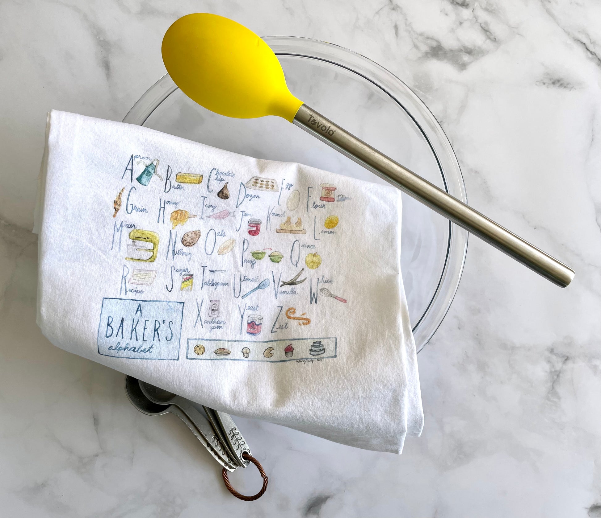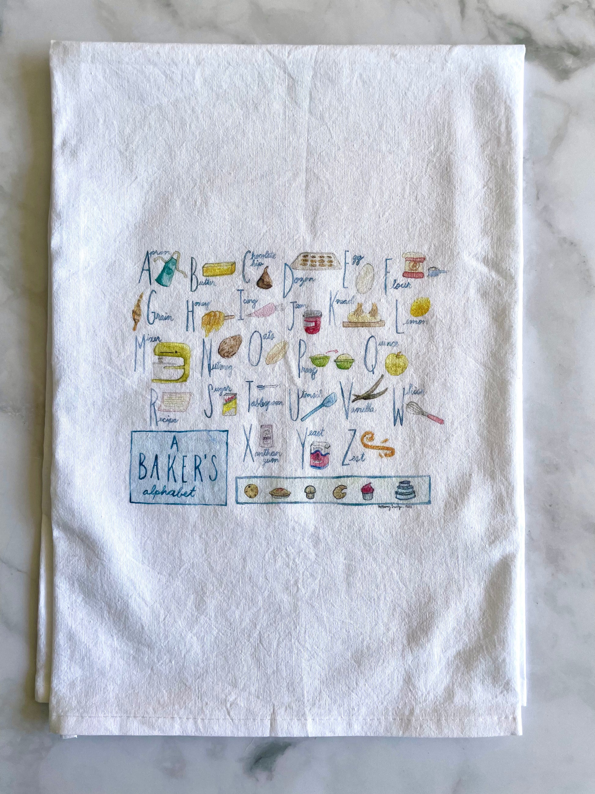 This 27" square 100% cotton tea towel adorned with a print of "A Baker's Alphabet" will look at home in any kitchen and is sure to bring a smile to any baker's face. Each letter of the alphabet is illustrated with a charming watercolor of a common baker's tool or ingredient.