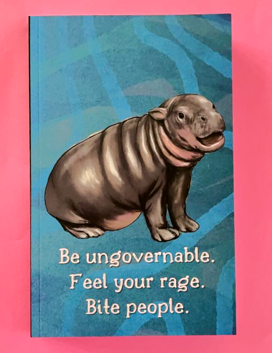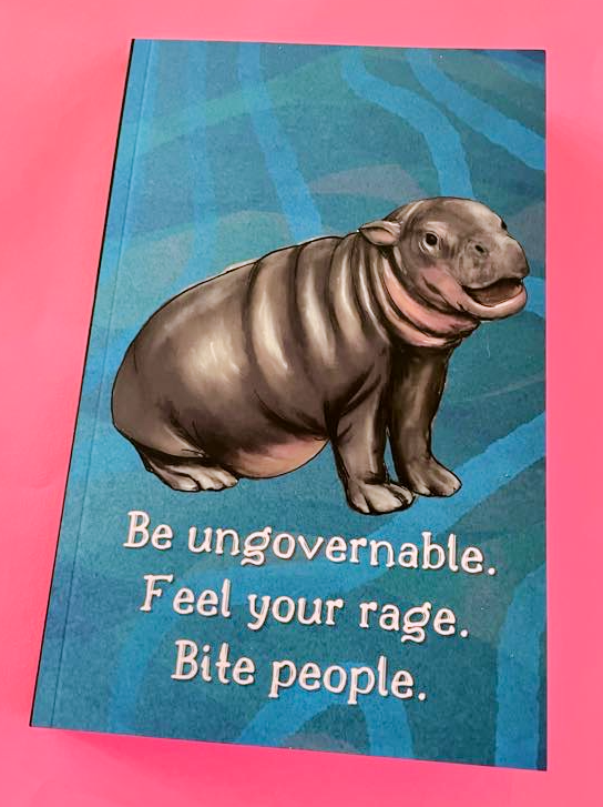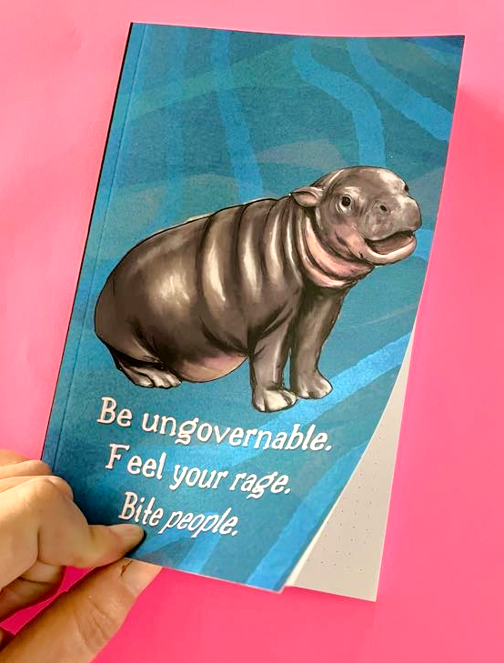 Meet the "Be Ungovernable" Notebook, a journal designed for those who aren't afraid to make a statement. Its vibrant blue, soft-touch cover showcases the iconic Moo Deng the hippo with the unforgettable phrase: "Be ungovernable. Feel your rage. Bite people." Inside, you'll find 144 pages of high-quality, gridded, 70lb recycled paper, thick enough for any pen. The layflat design ensures a comfortable writing experience, making it the ideal space to capture your truest, most unfiltered self.