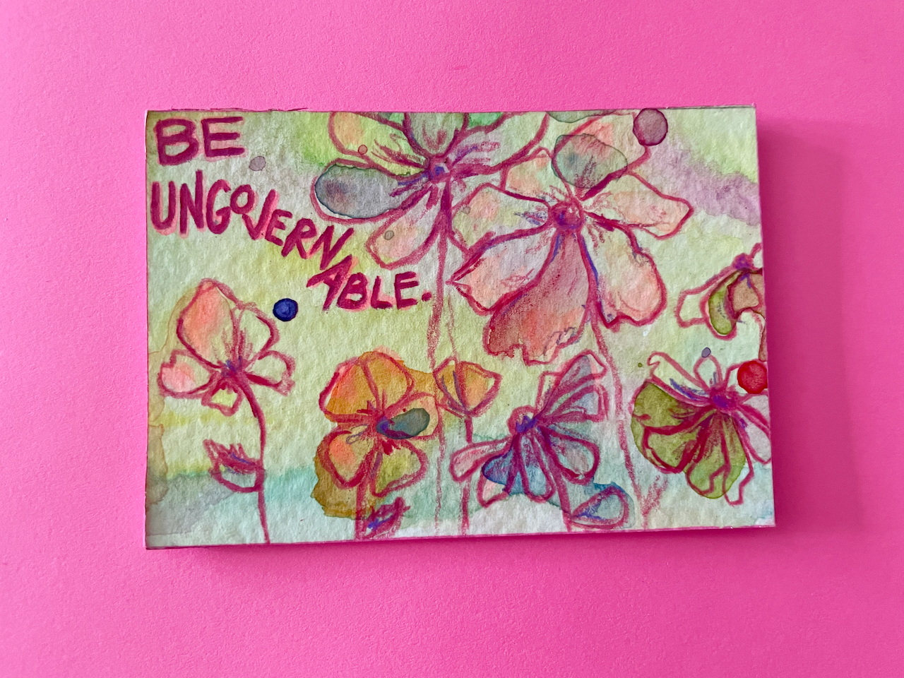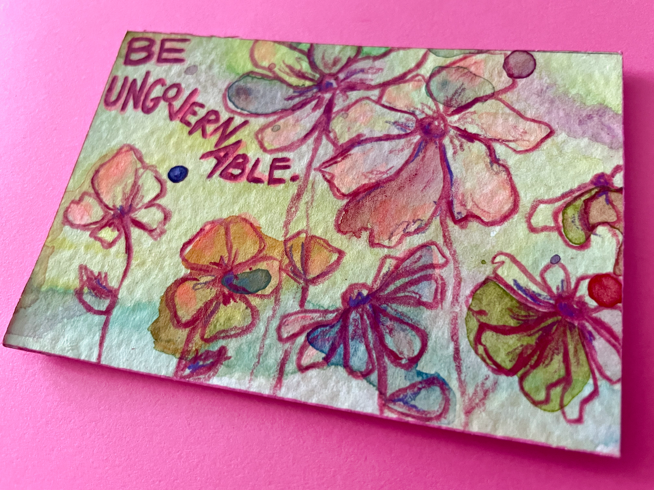 This is a tiny world of color, created with free-flowing watercolor and acrylic backgrounds that feature colored pencil florals and the phrase "Be Ungovernable," an important reminder in today's world.