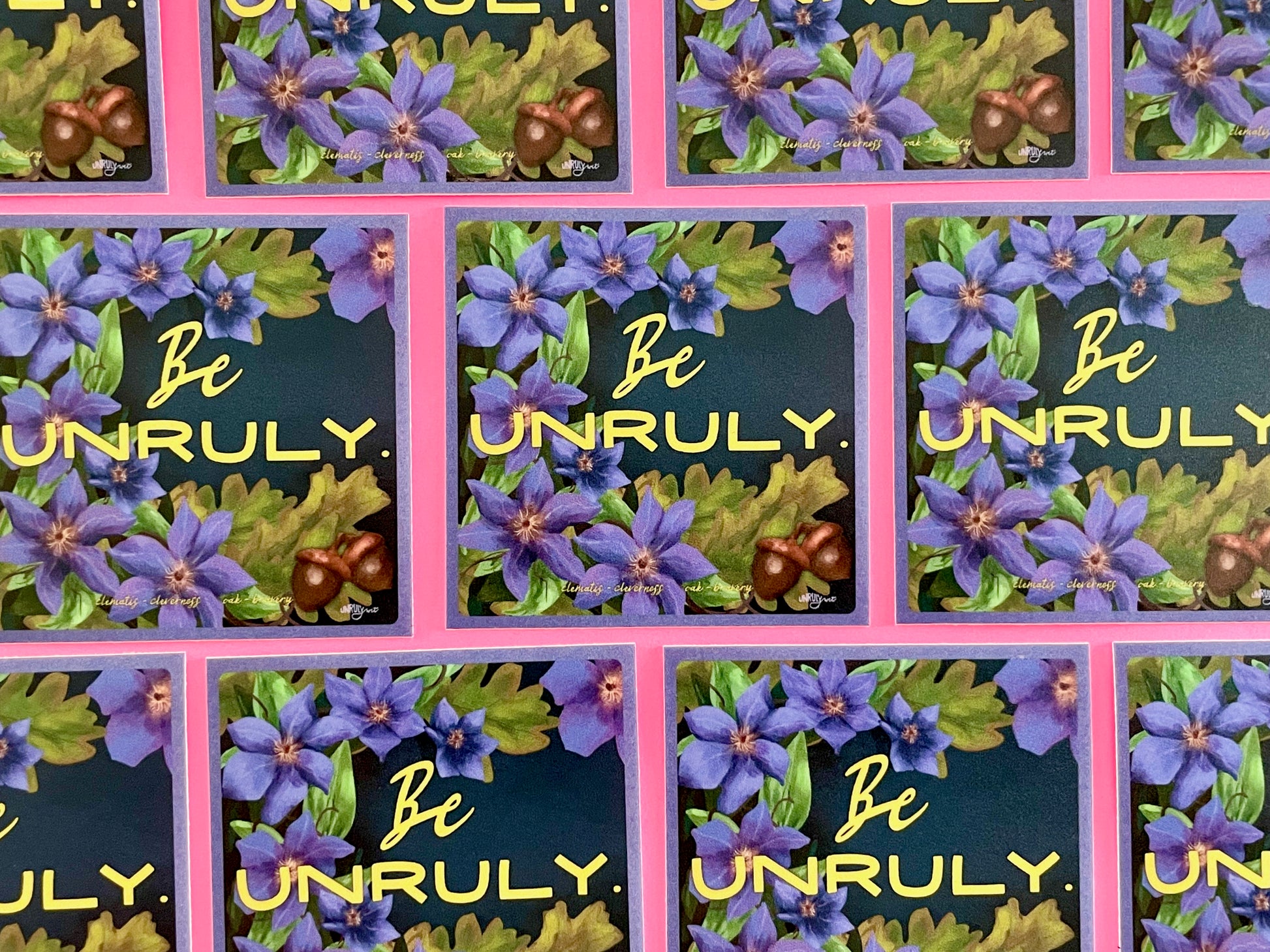 Embrace your inner rebel with the "Be Unruly" 2.5" square vinyl sticker! Featuring vibrant clematis, symbolizing cleverness, and strong oak leaves, representing bravery, this sticker is a call to action. More than just a design, it's a nod to Unruly Wit's spirit: a celebration of sharp minds and courageous hearts. Stick it anywhere you need a reminder to challenge the status quo and live boldly. Durable and designed to spark conversation, this sticker is a perfect expression of your Unruly Wit.