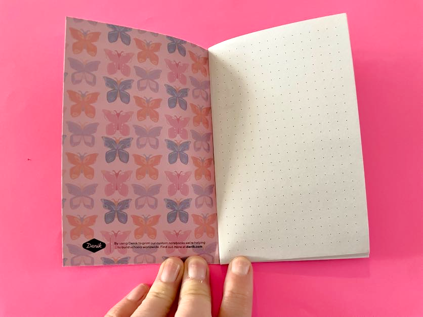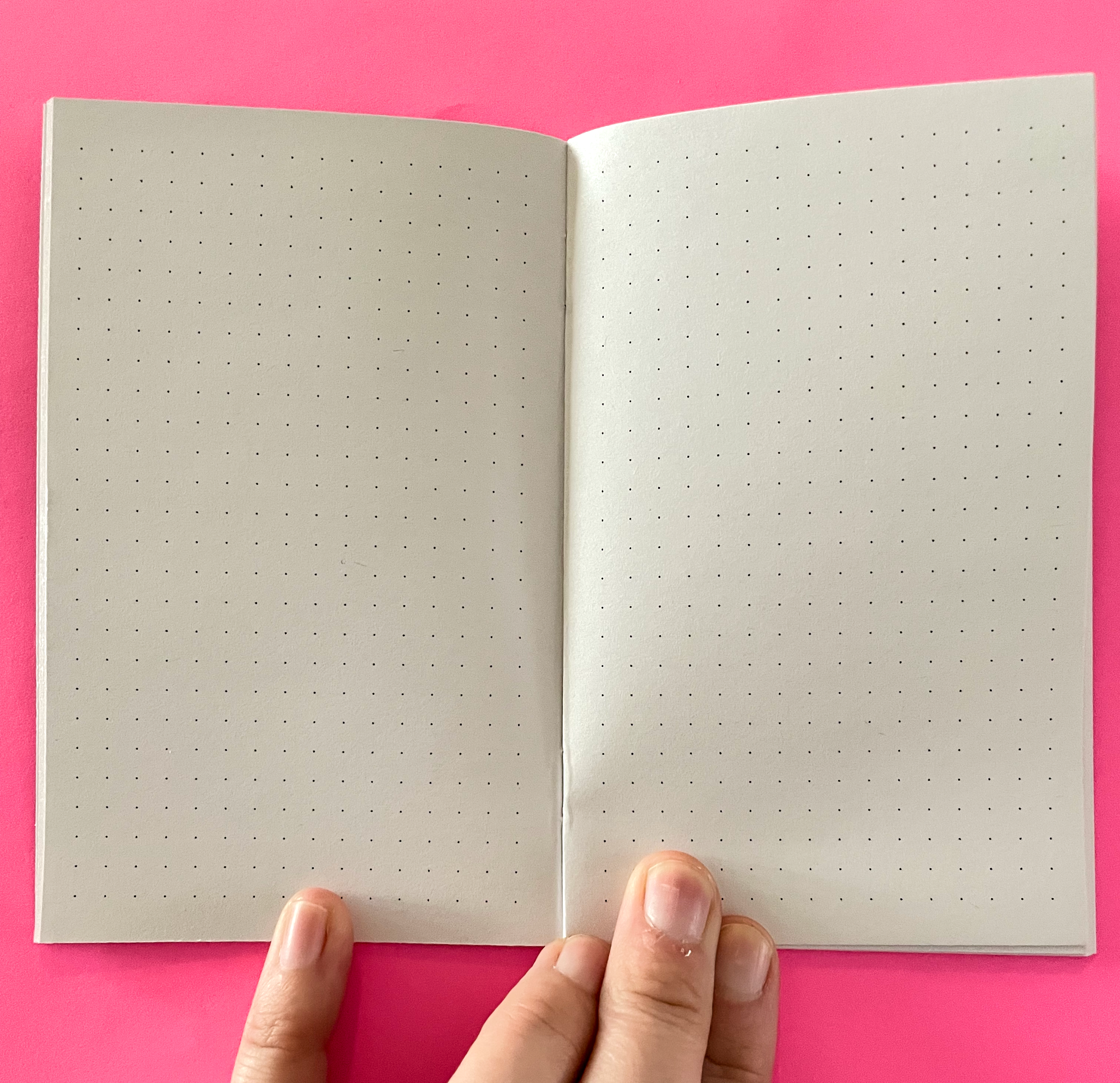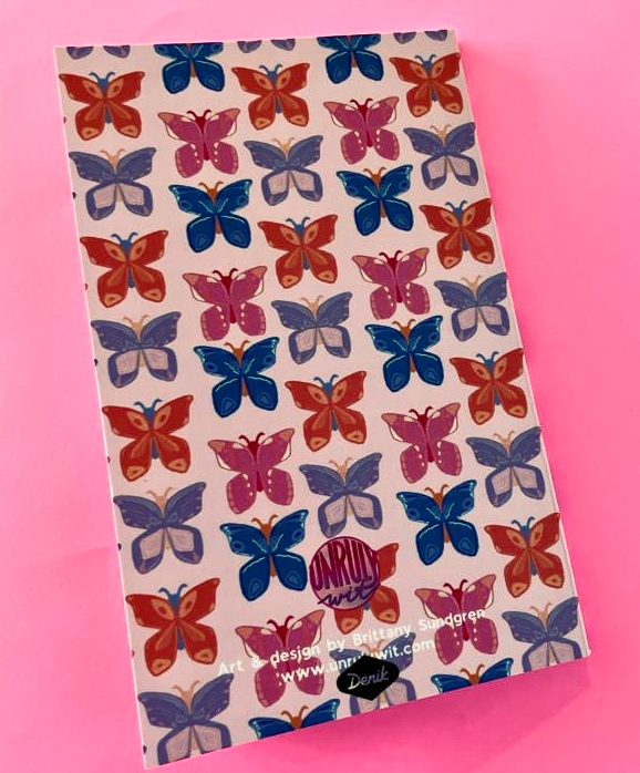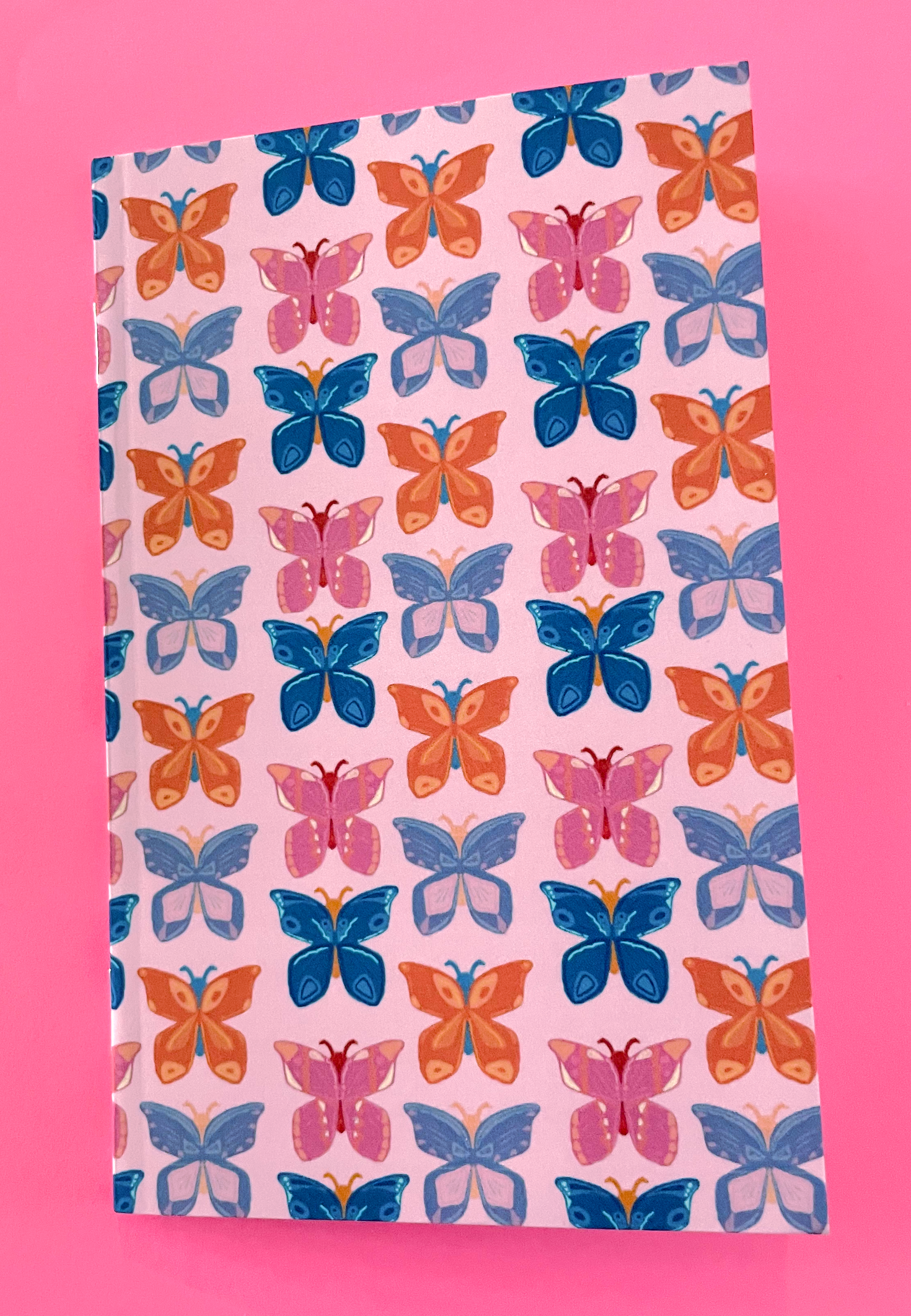 This pocket-sized notebook (3.5"x5.5") is the perfect companion for your daily thoughts and plans. The soft-touch cover features a peaceful, cheerful repeating pattern of butterflies. Inside, you'll find 48 pages of high-quality, 70lb grid paper, ideal for notes, sketches, or bullet journaling. The saddle-stitched binding makes it lightweight and durable, ready to go wherever you do.
