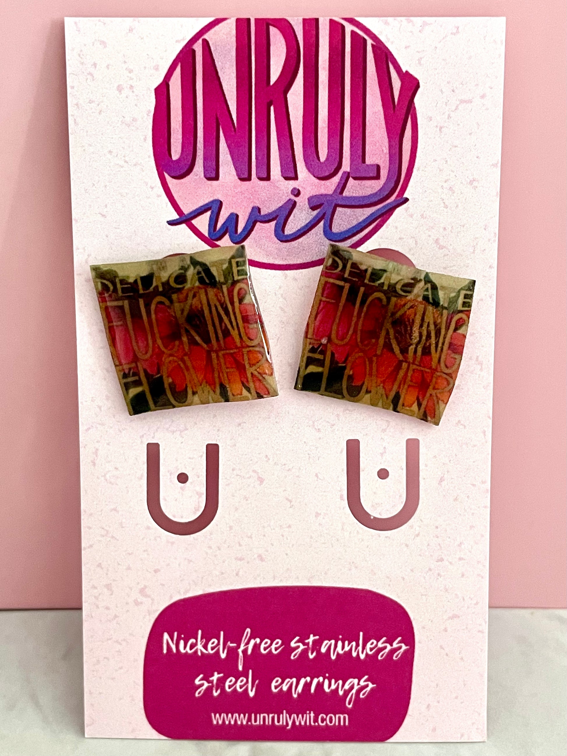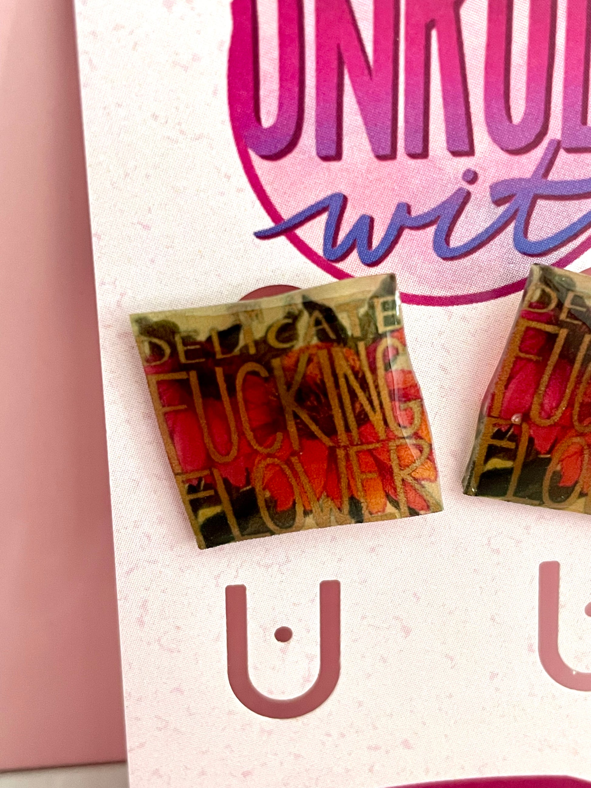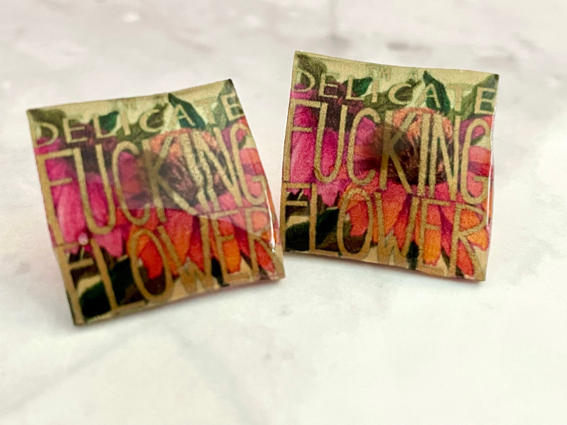 Blooming with confidence, these handmade Delicate Fucking Flower Translucent Stud Earrings feature coneflowers, symbolizing strength, on lightweight acrylic studs. Let your attitude shine with these nickel-free stainless steel posts. Show the world your bold and adventurous side.