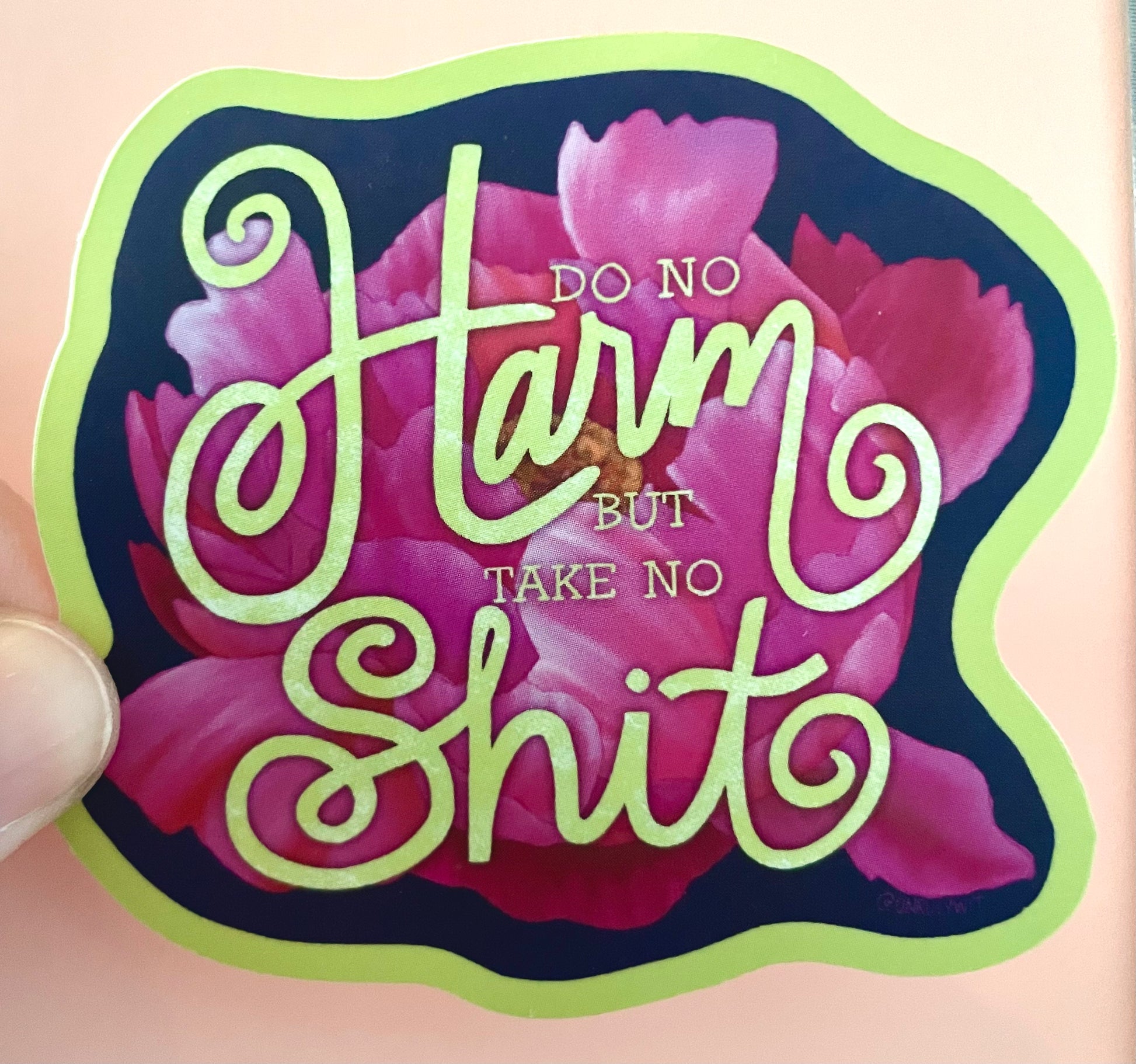 Need a reminder to stand up for yourself and your values? Look no further than our Do No Harm But Take No Shit Peony Sticker. Featuring a delicate pink peony design, this 3 inch vinyl sticker is waterproof and perfect for any surface. Be empowered and make a statement with this must-have sticker.