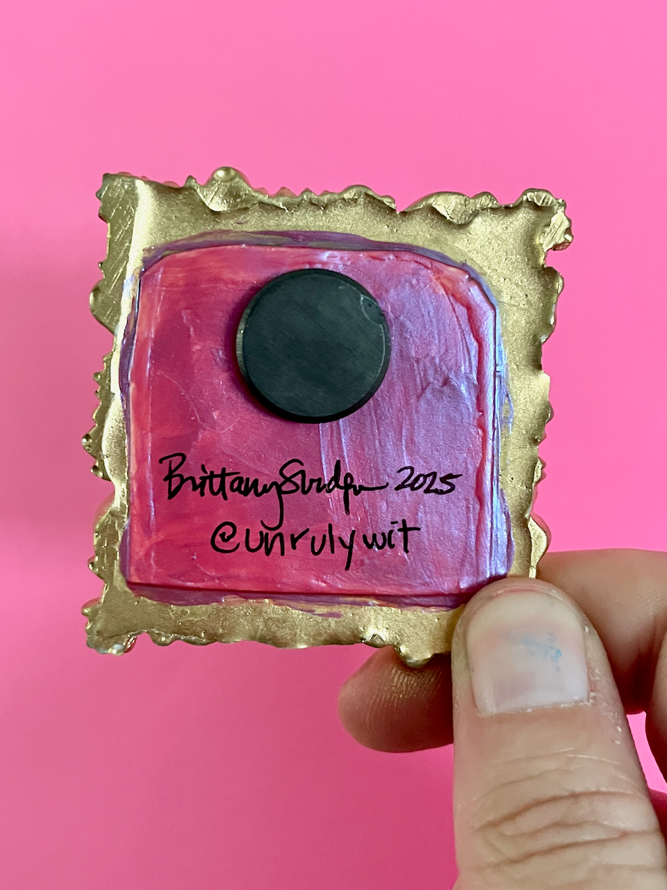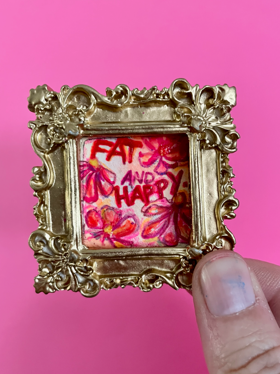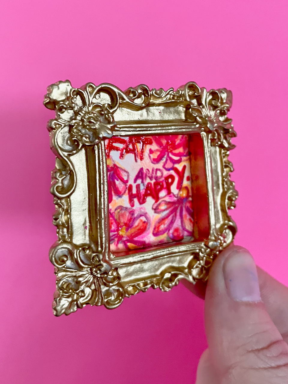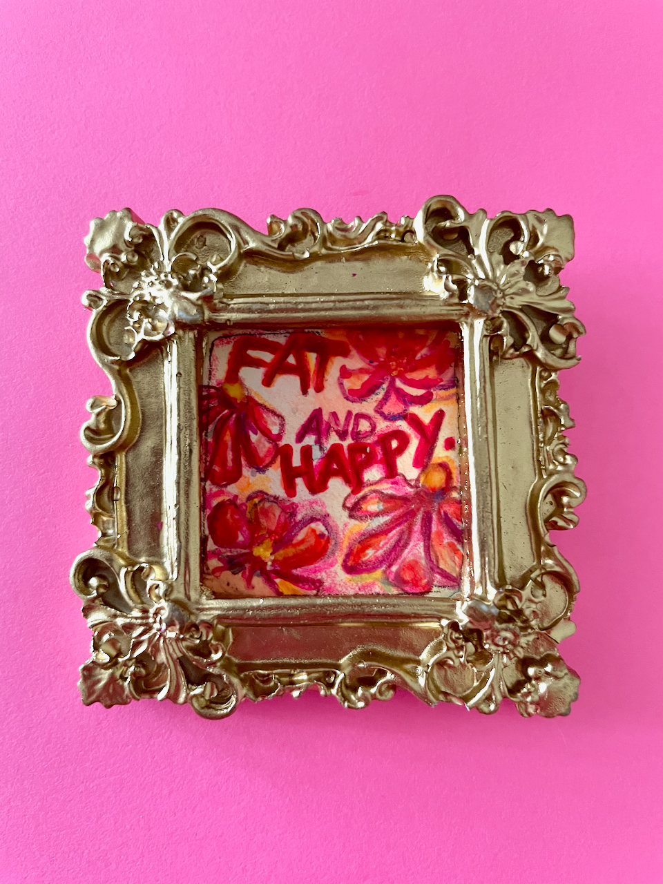 A little watercolor & colored pencil masterpiece, just for your fridge - reminding you to keep on being "fat and happy". Each tiny, hand-drawn design features a unique floral motif and a snarky, sweet, or affirming phrase. Set in a hand-cast, ornate, vintage-inspired frame with a strong magnet on the back, this little piece of art is perfect for adding a pop of personality to any magnetic surface.