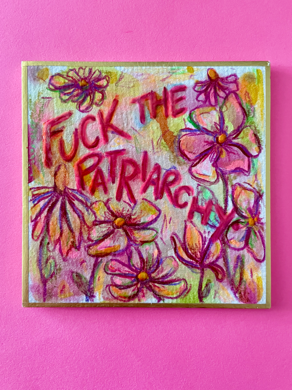 This is a tiny world of color, created with free-flowing watercolor and acrylic backgrounds that feature colored pencil florals and the phrase "Fuck the Patriarchy," which, honestly, need I say more?