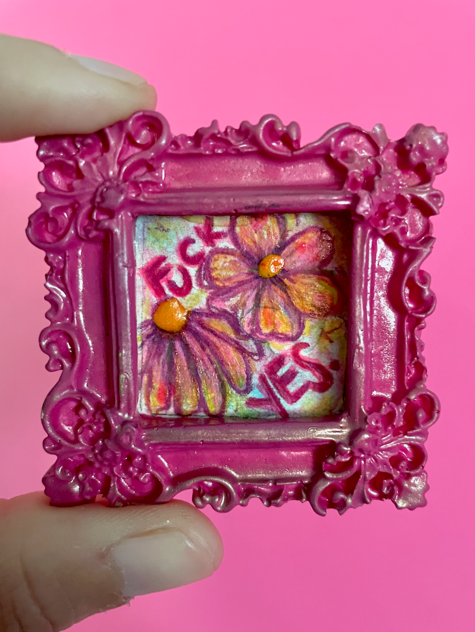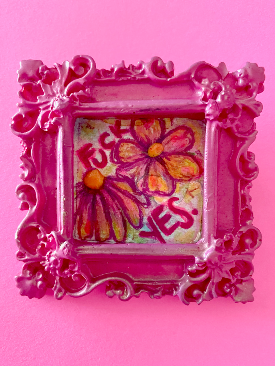 A little watercolor & colored pencil masterpiece, just for your fridge - reminding you to say "Fuck yes" sometimes! Each tiny, hand-drawn design features a unique floral motif and a snarky, sweet, or affirming phrase. Set in a hand-cast, ornate, vintage-inspired frame with a strong magnet on the back, this little piece of art is perfect for adding a pop of personality to any magnetic surface.