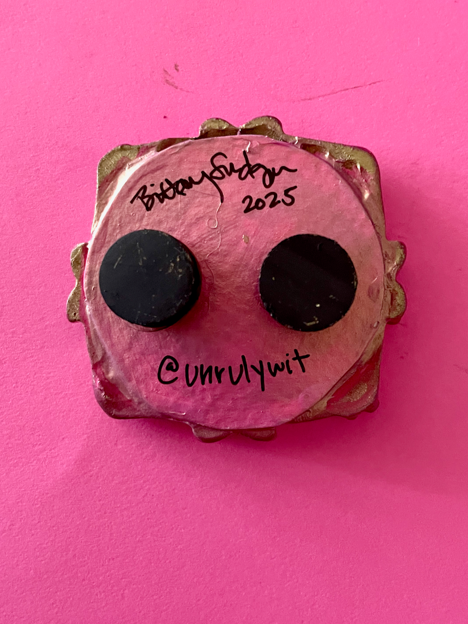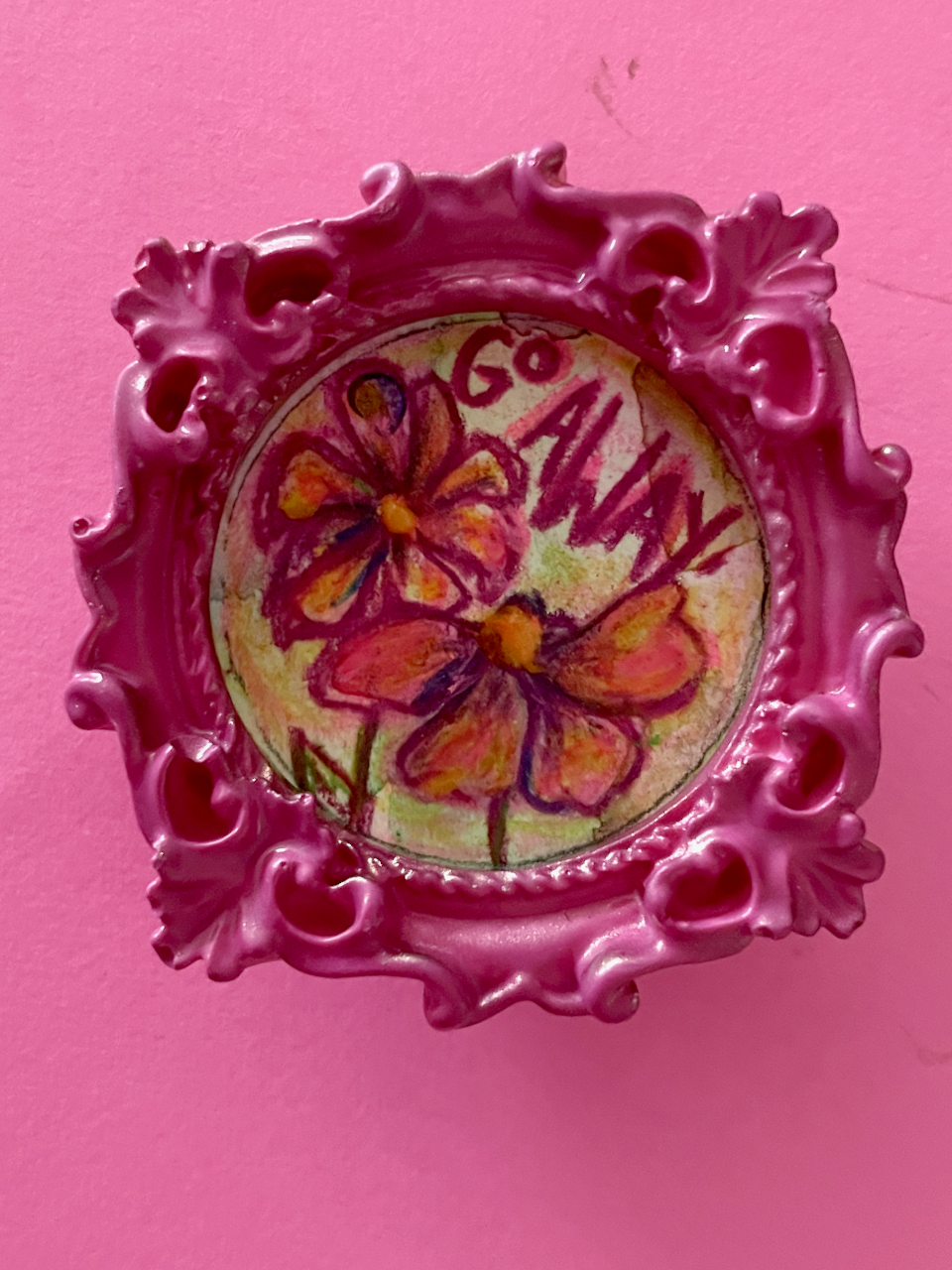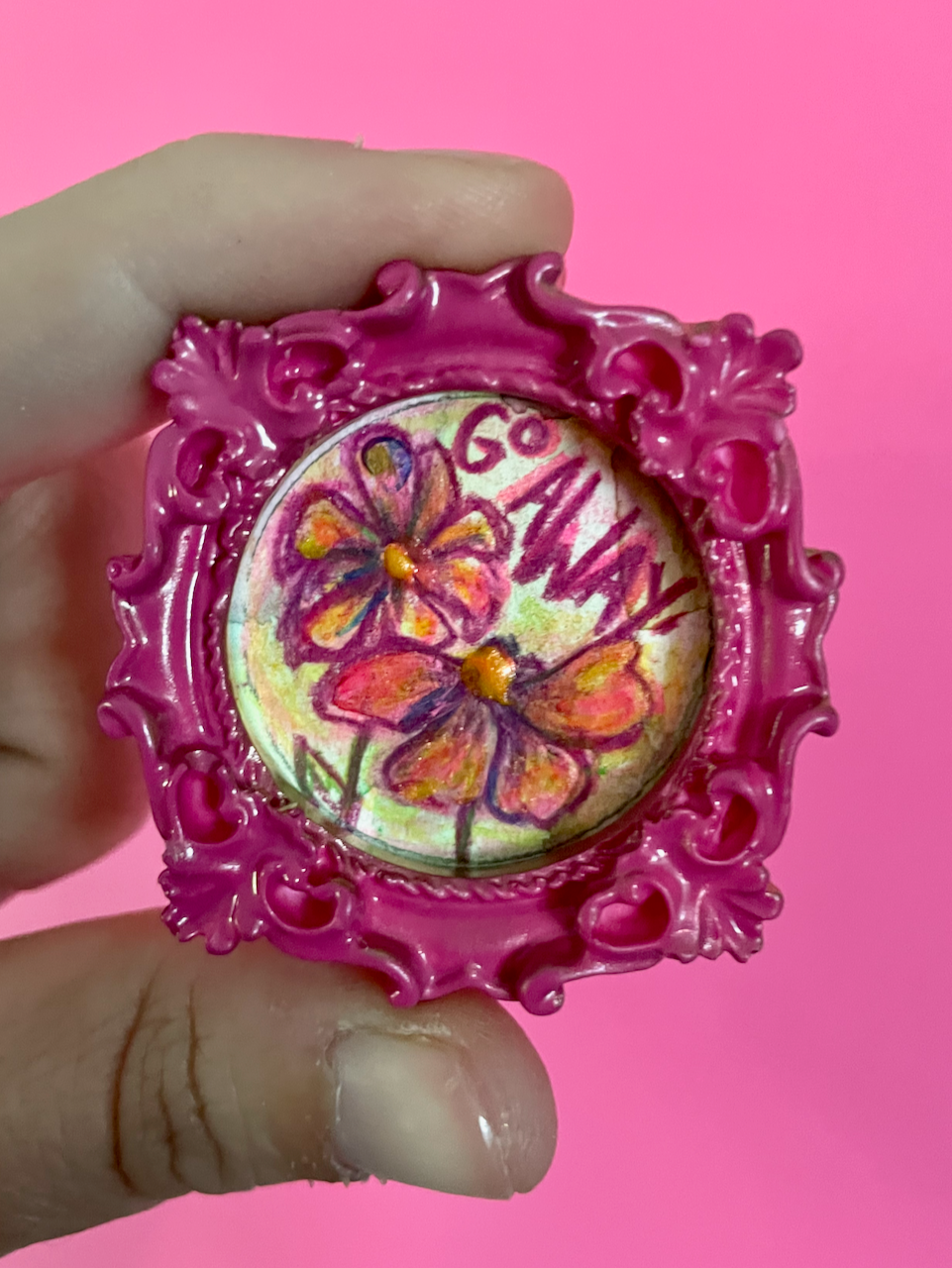 A little watercolor & colored pencil masterpiece, just for your fridge or any magnetic surface. Let folks know to leave you alone - sometimes we all need some quiet time. Each tiny, hand-drawn design features a unique floral motif and a snarky, sweet, or affirming phrase. Set in a hand-cast, ornate, vintage-inspired frame with a strong magnet on the back, this little piece of art is perfect for adding a pop of personality to any magnetic surface.