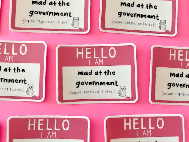 This durable 3" waterproof vinyl sticker features a classic nametag design with a pointed message: "Hello, I Am Mad at the Government. Equal rights or I bites," accompanied by a doodle of an annoyed cat.