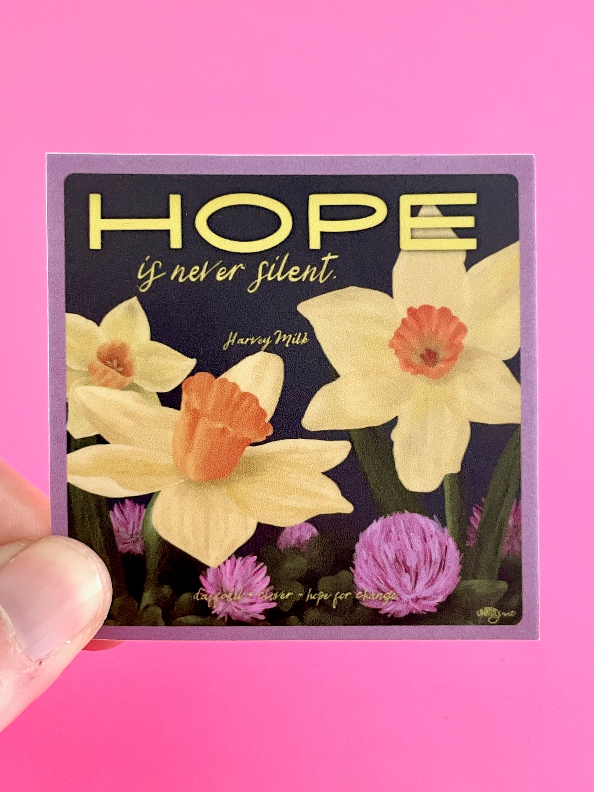 Let your voice bloom with this 2.5" square vinyl sticker. Featuring vibrant daffodils and clover, symbols of hope for change, alongside Harvey Milk's unwavering declaration, "Hope is never silent." This sticker serves as a powerful reminder to speak up, stand strong, and believe in a brighter future. Durable and impactful, it's perfect for adding a touch of resilient optimism to your everyday items.