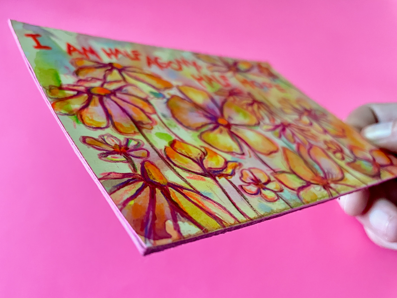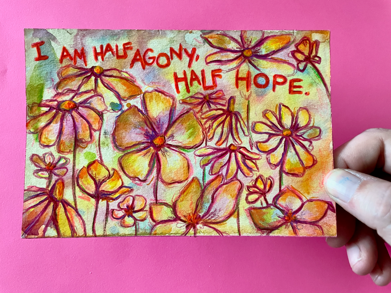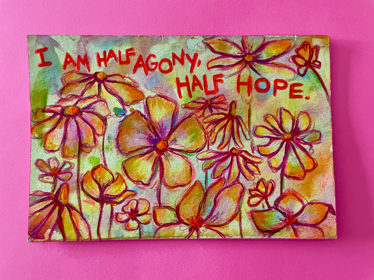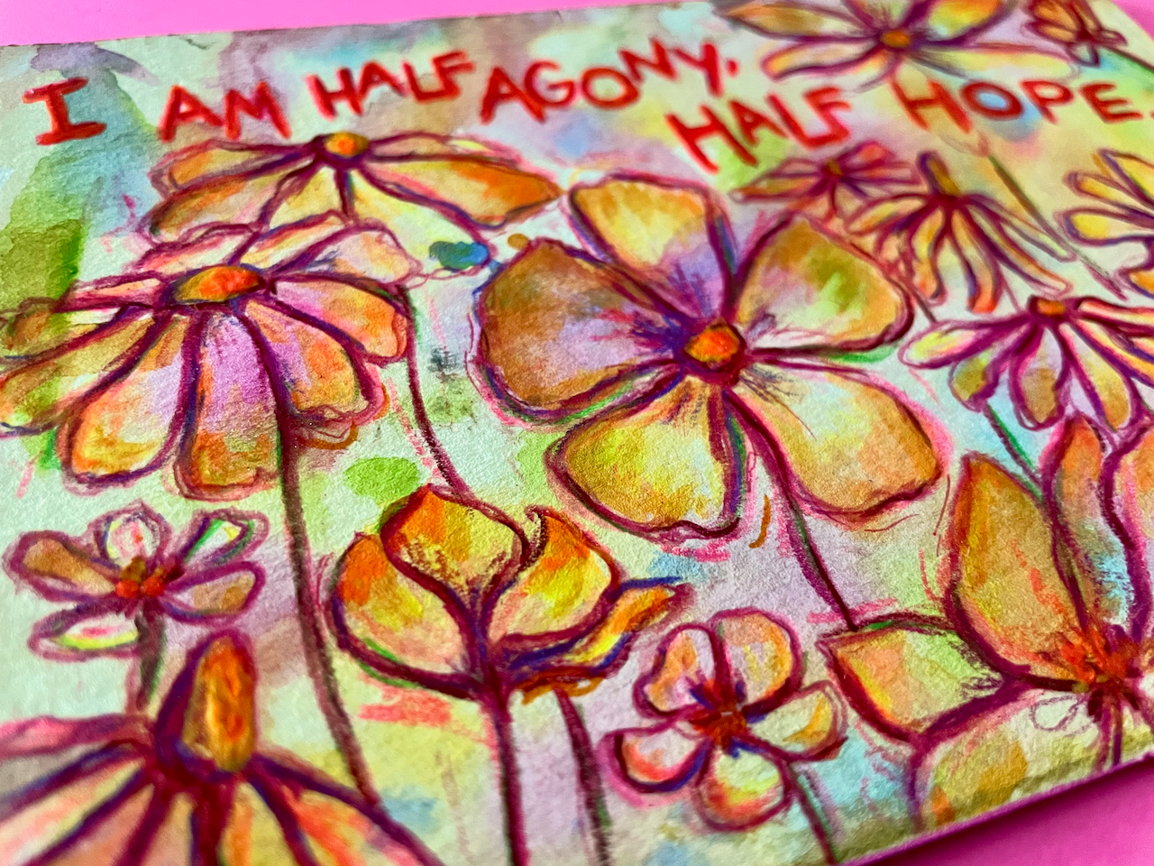 This is a tiny world of color, created with free-flowing watercolor and acrylic backgrounds that feature colored pencil florals and the phrase "I Am Half Agony, Half Hope," from Jane Austen's Persuasion.