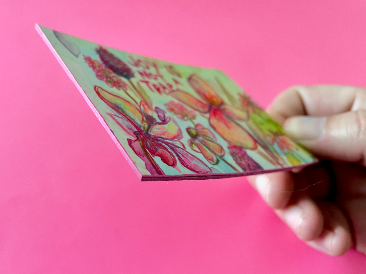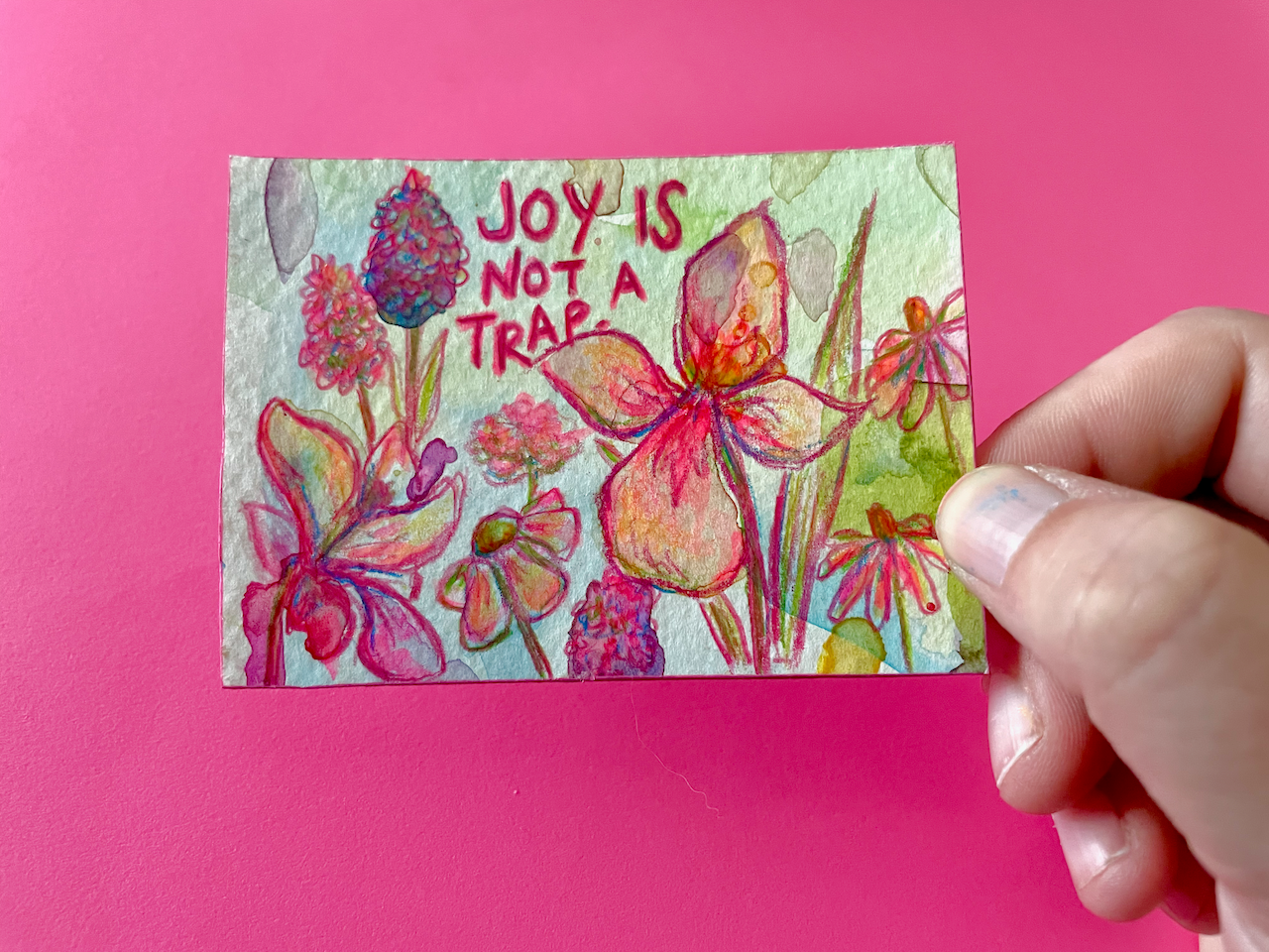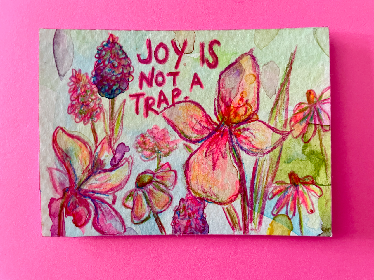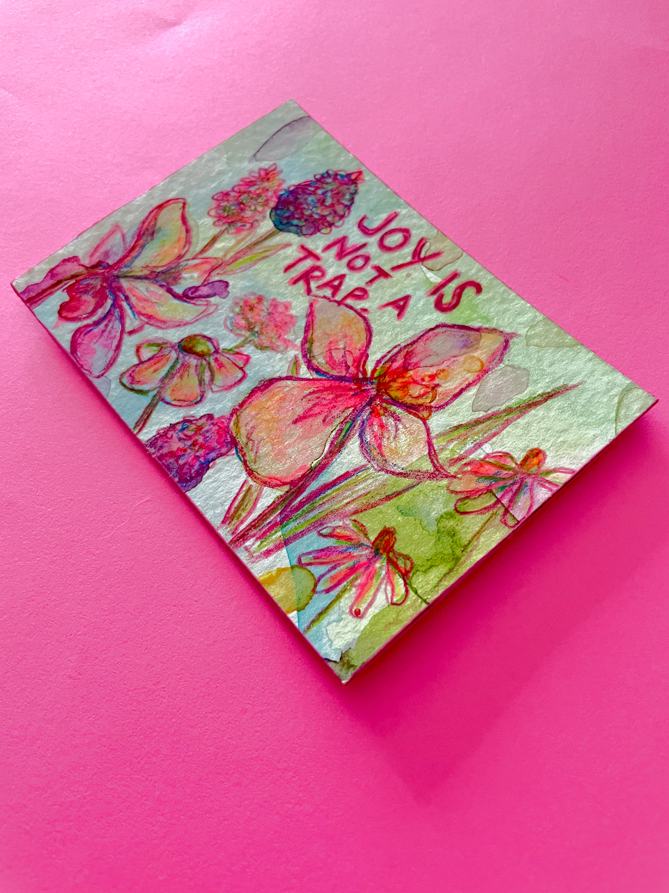 This is a tiny world of color, created with free-flowing watercolor and acrylic backgrounds that feature colored pencil florals and the phrase "Joy Is Not A Trap" -- a reminder to let yourself enjoy and appreciate moments of joy without anxiety.