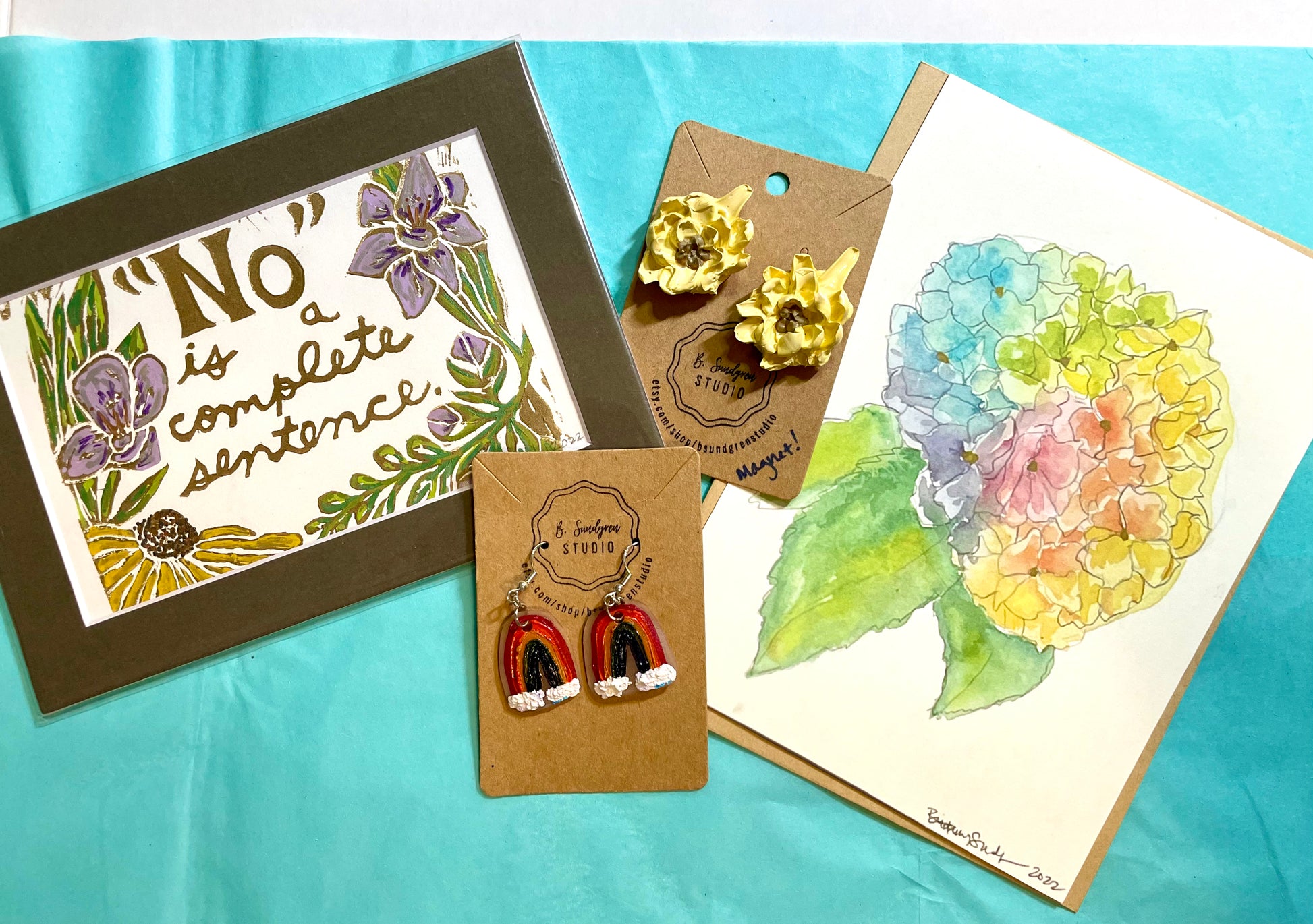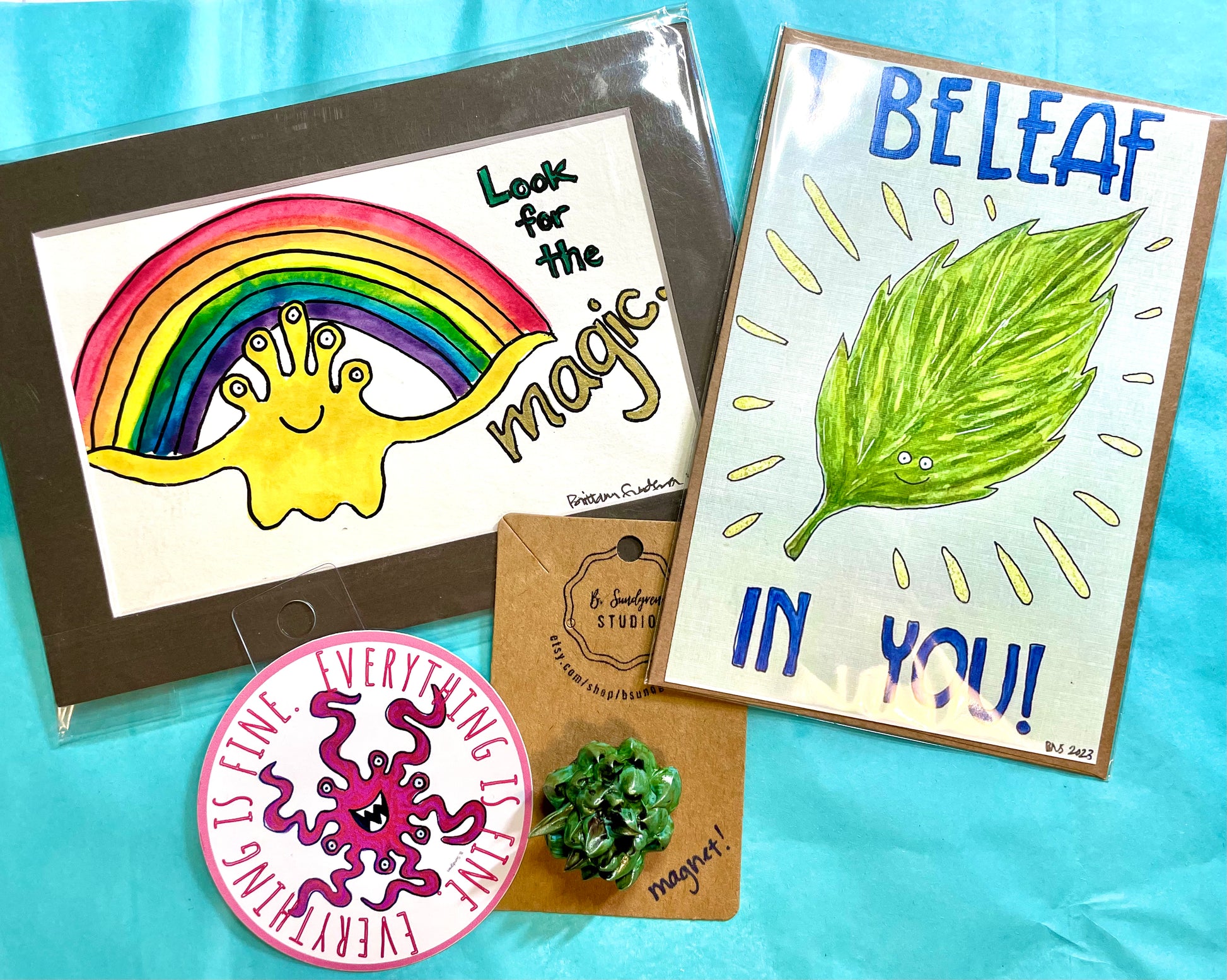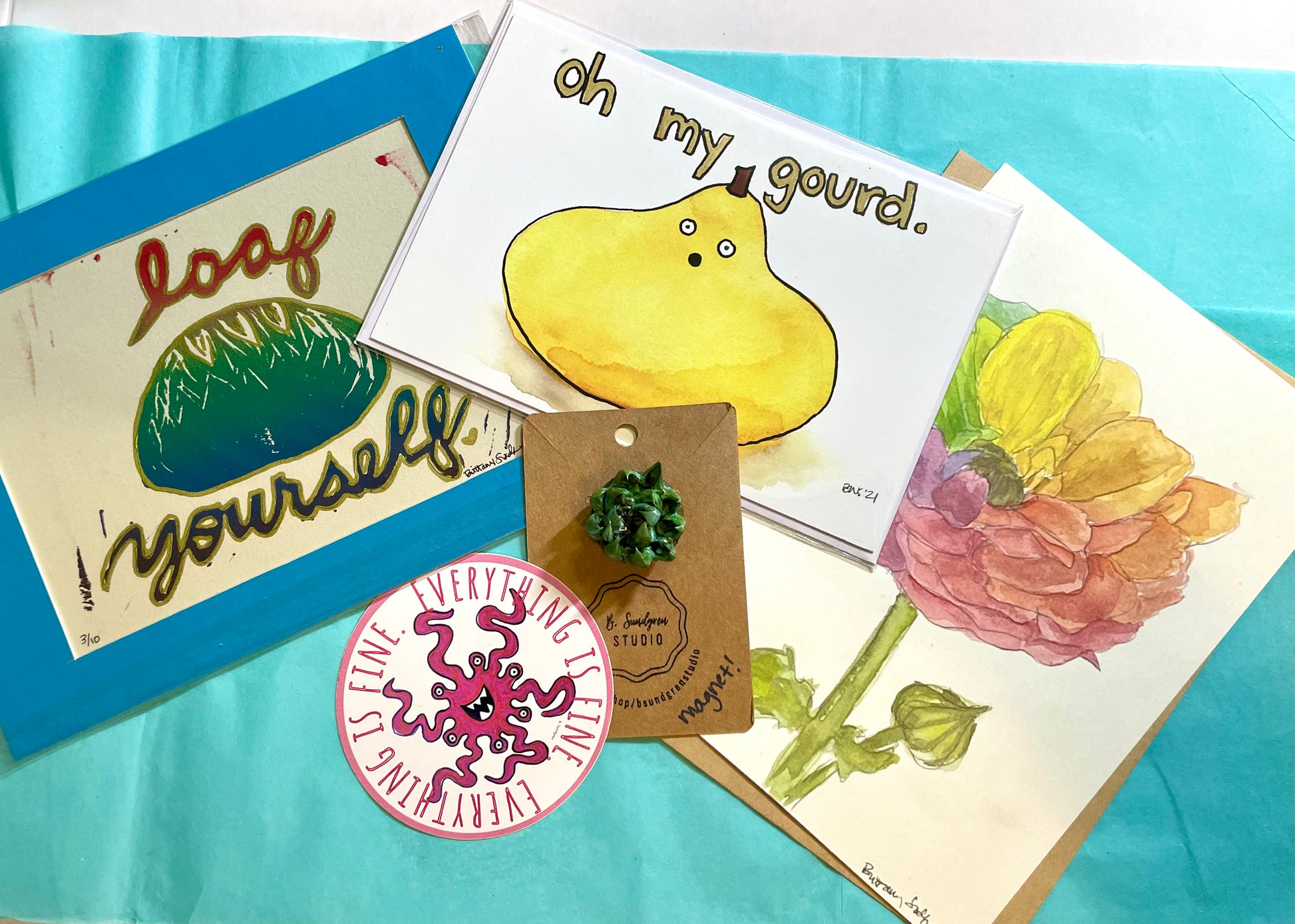 Each bundle will include 3-5 items for a total value of $30 or more - for only $20! Items may include cards, stickers, prints, small original works, small embroidered pieces, and jewelry. There will be a mix of older work (including last-chance cards in old styles we won’t be printing anymore!) and new work in each pack.