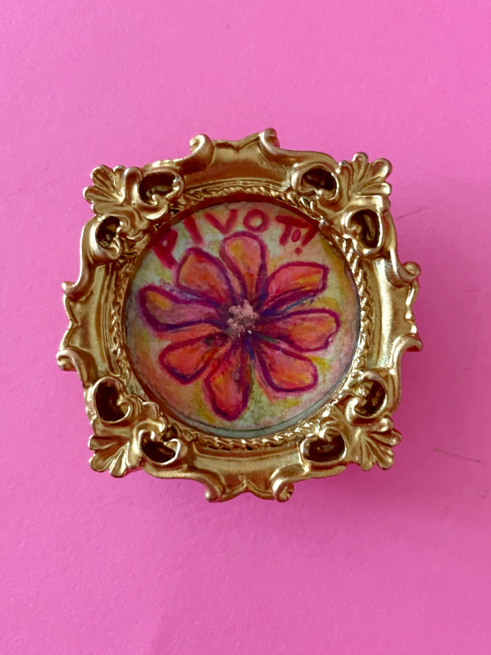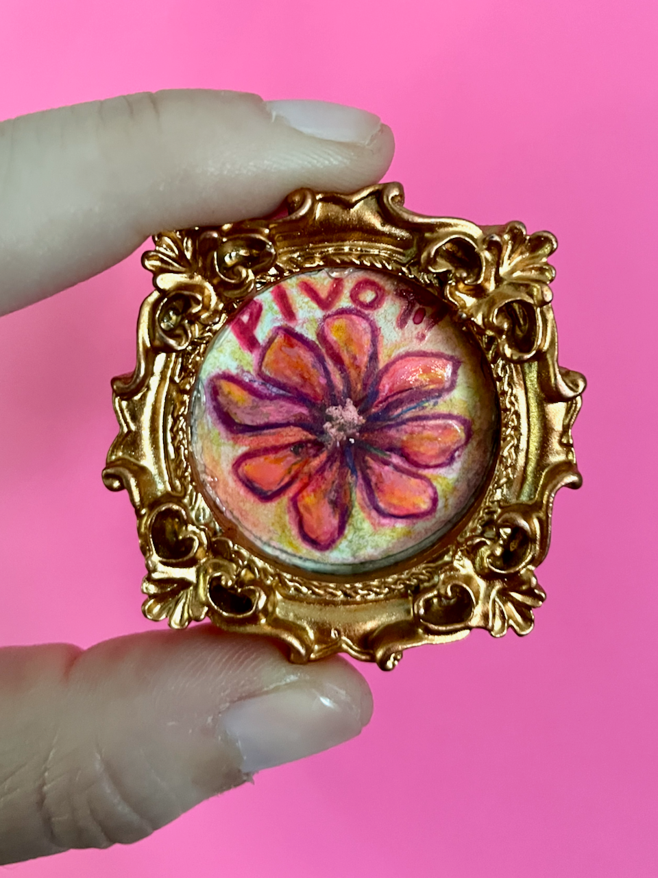A little watercolor & colored pencil masterpiece, just for your fridge or any magnetic surface. In a nod to one of the greatest television shows (Friends, of course), this reminds you to "Pivot!" Each tiny, hand-drawn design features a unique floral motif and a snarky, sweet, or affirming phrase. Set in a hand-cast, ornate, vintage-inspired frame with a strong magnet on the back, this little piece of art is perfect for adding a pop of personality to any magnetic surface.