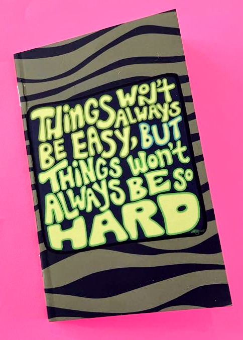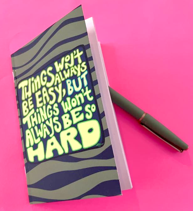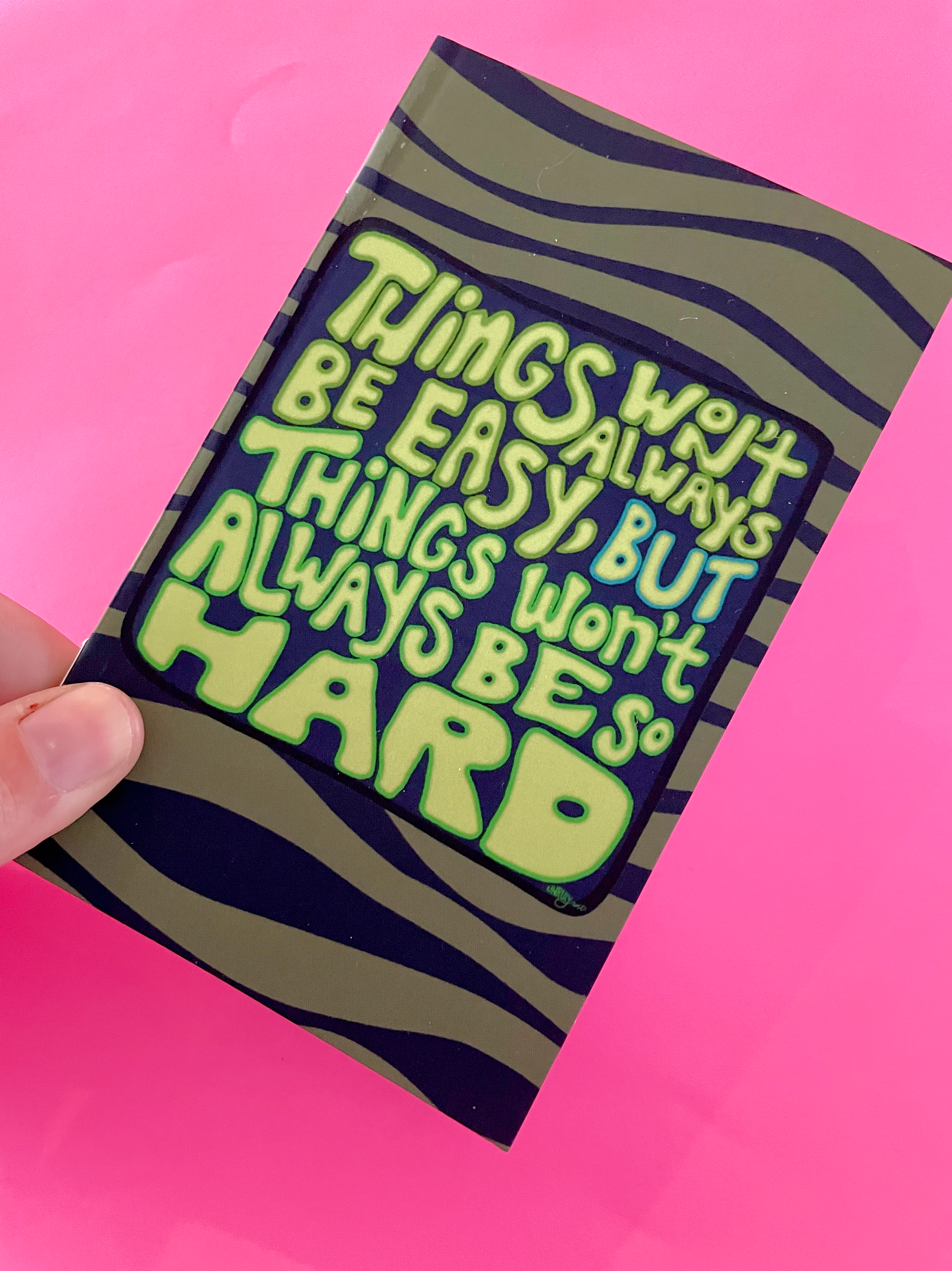 This pocket-sized notebook (3.5"x5.5") is the perfect companion for your daily thoughts and plans. The soft-touch cover features a soothing design of green and navy wavy stripes and a hand-lettered reminder: "Things won't always be easy, but they won't always be so hard." Inside, you'll find 48 pages of high-quality, 70lb grid paper, ideal for notes, sketches, or bullet journaling. The saddle-stitched binding makes it lightweight and durable, ready to go wherever you do.