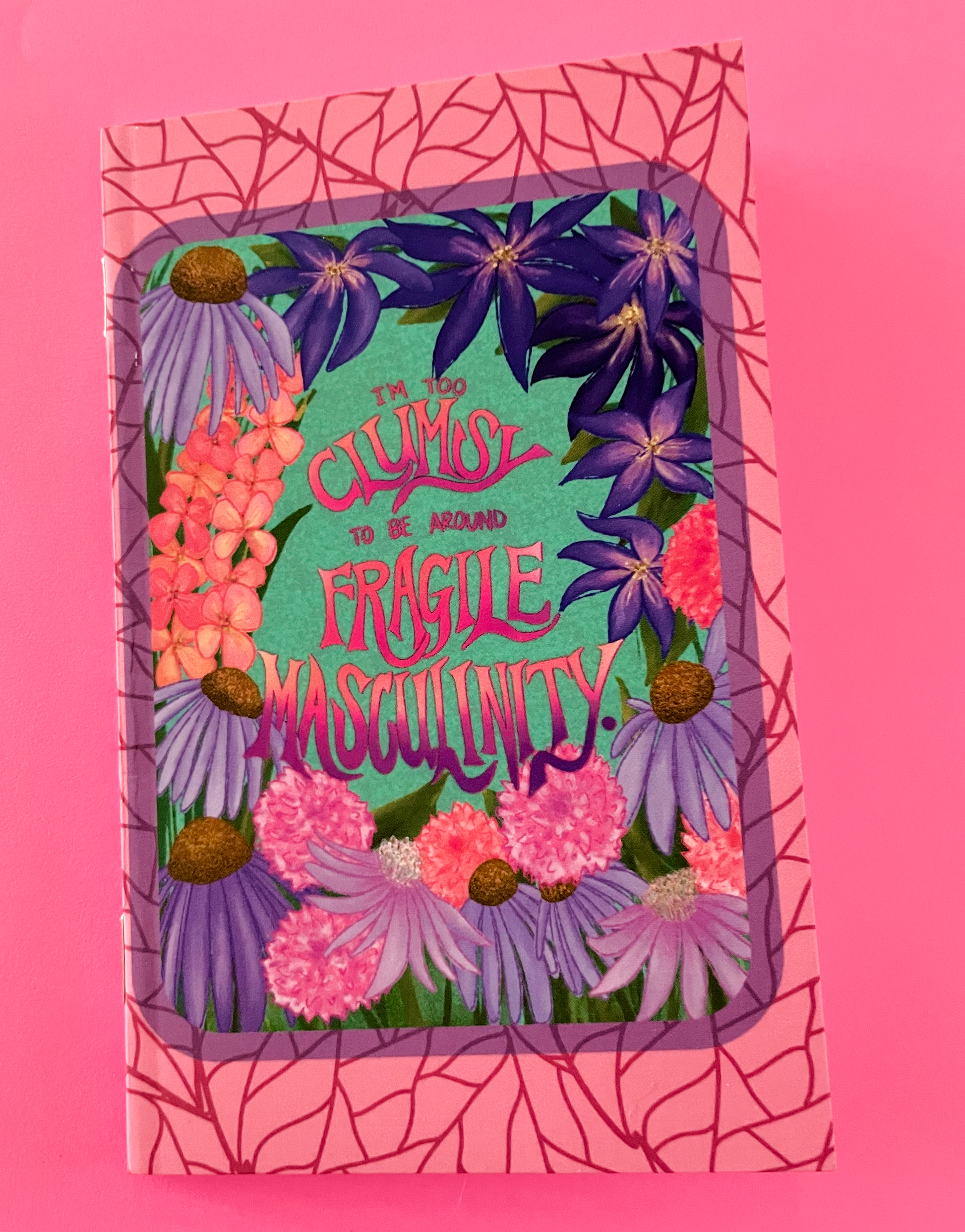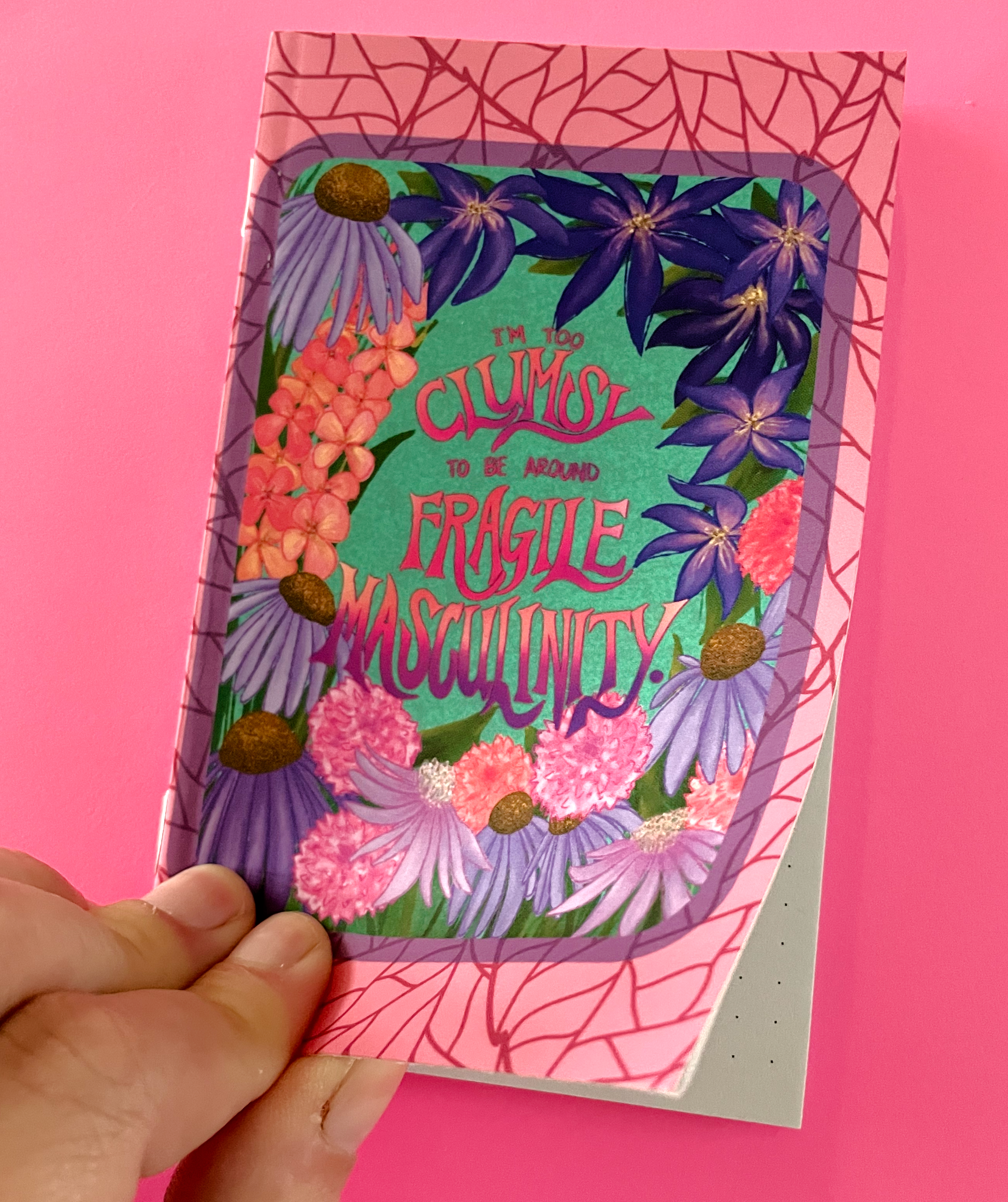 This pocket-sized notebook (3.5"x5.5") is the perfect companion for your daily thoughts and plans. The soft-touch cover features the phrase, "I"m Too Clumsy to be Around Fragile Masculinity," as well as drawings of flowers that have significance that supports the message of the piece: