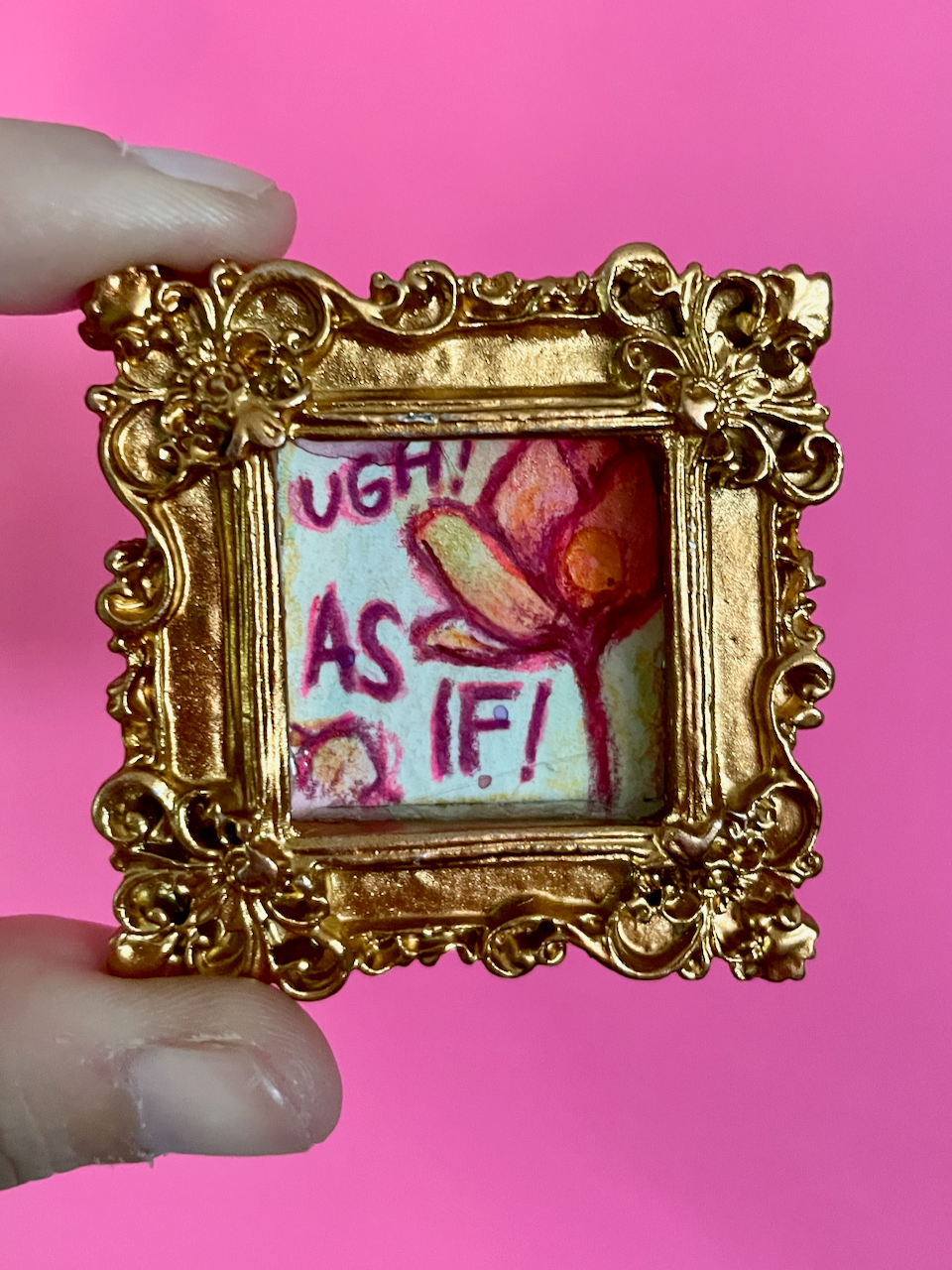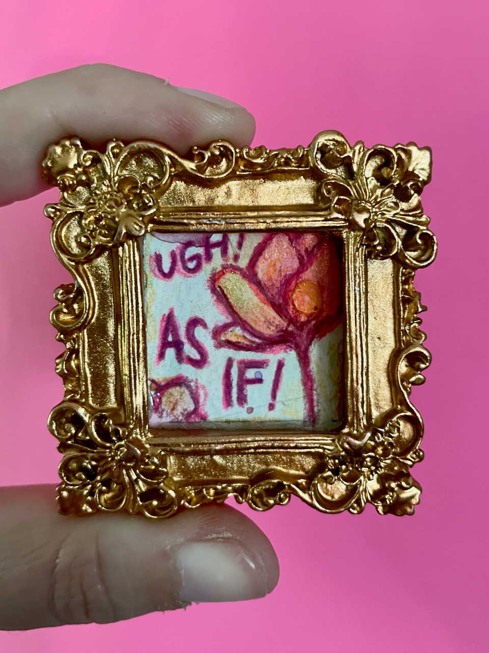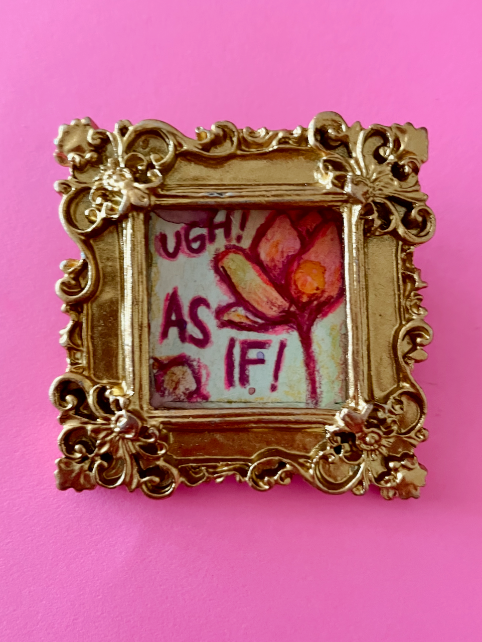 A little watercolor & colored pencil masterpiece, just for your fridge or any magnetic surface. Express your annoyance with, well, just about anything. Each tiny, hand-drawn design features a unique floral motif and a snarky, sweet, or affirming phrase. Set in a hand-cast, ornate, vintage-inspired frame with a strong magnet on the back, this little piece of art is perfect for adding a pop of personality to any magnetic surface.