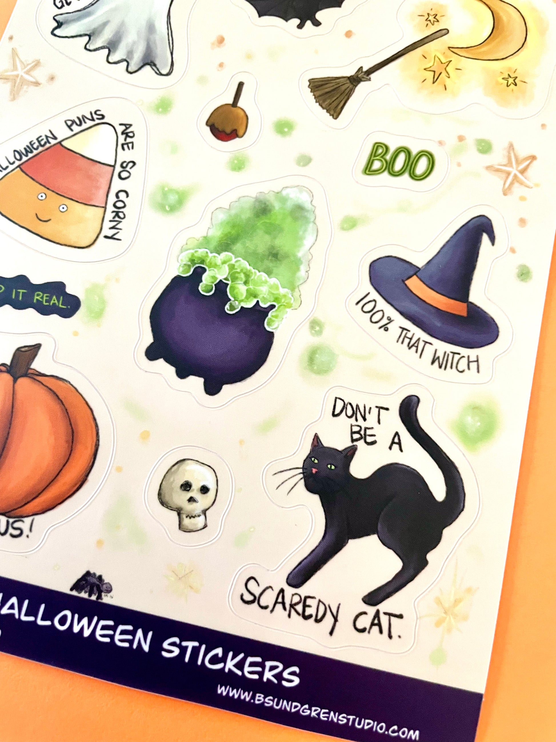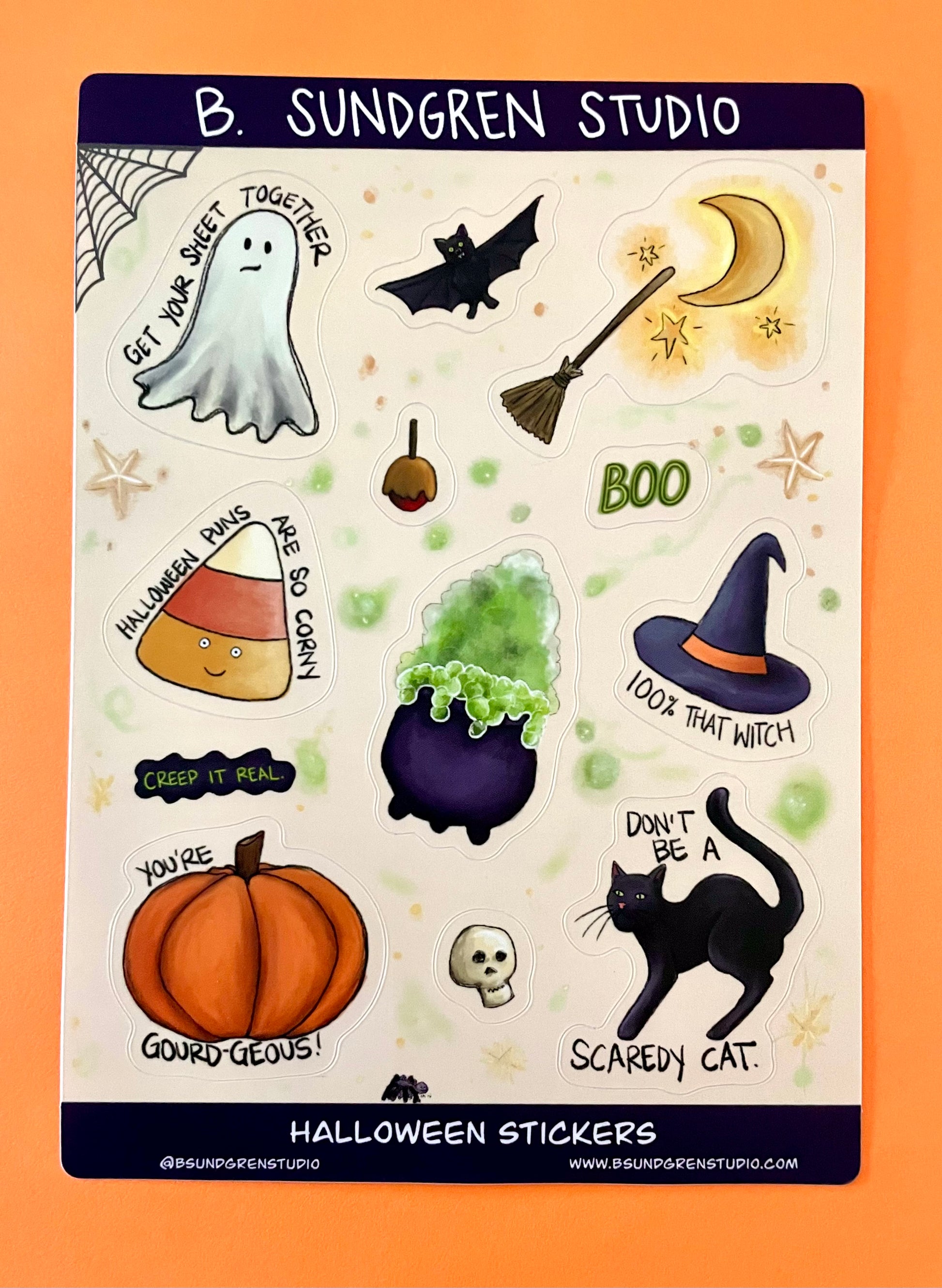 Add some spooky to your supply collection with our Halloween Sticker Sheet! Perfect for your phone case, journal, letters, and more, these vinyl and waterproof stickers are punny, artsy, and ready to bewitch your everyday life. Embrace your inner child and get decorating with these 11 Halloween-themed stickers - printed in Longmont, CO with love!