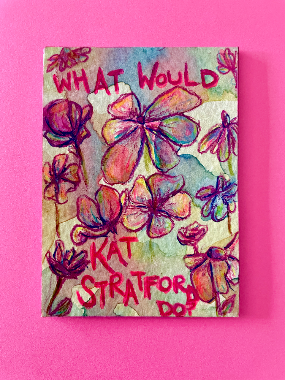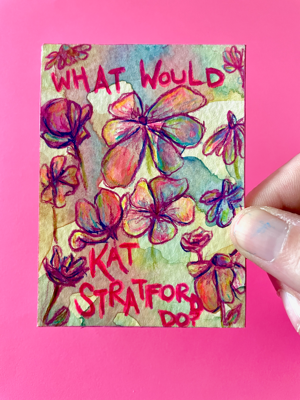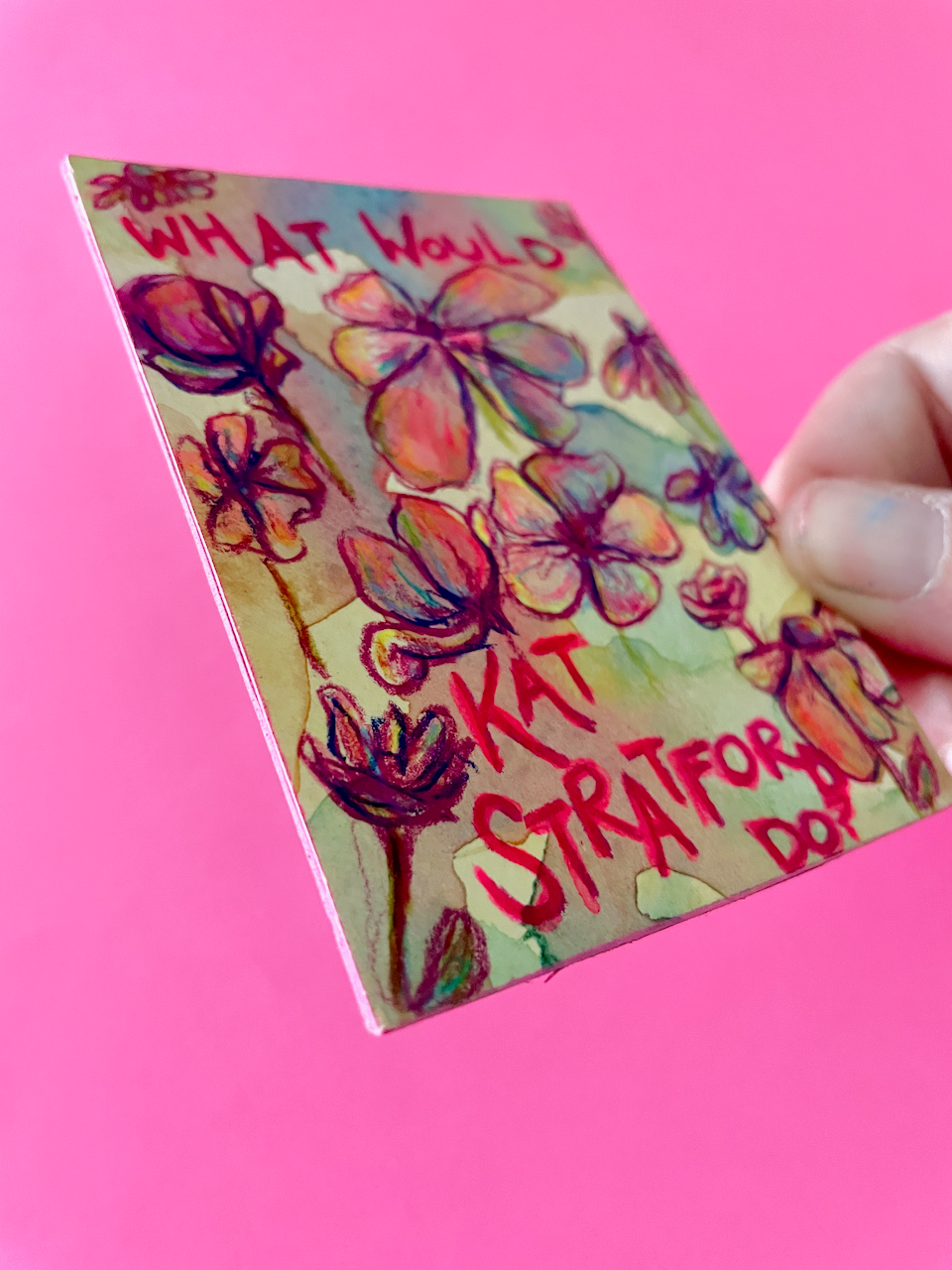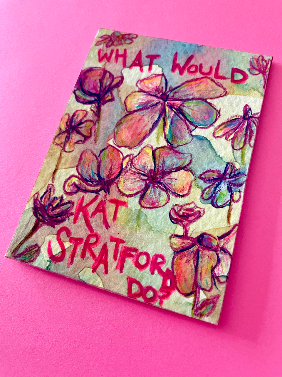 This is a tiny world of color, created with free-flowing watercolor and acrylic backgrounds that feature colored pencil florals and the phrase "What Would Kat Stratford Do?" -- a reference to your favorite fictional feminist badass from the classic teen comedy 10 Things I Hate About You.