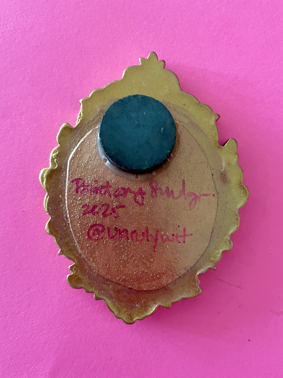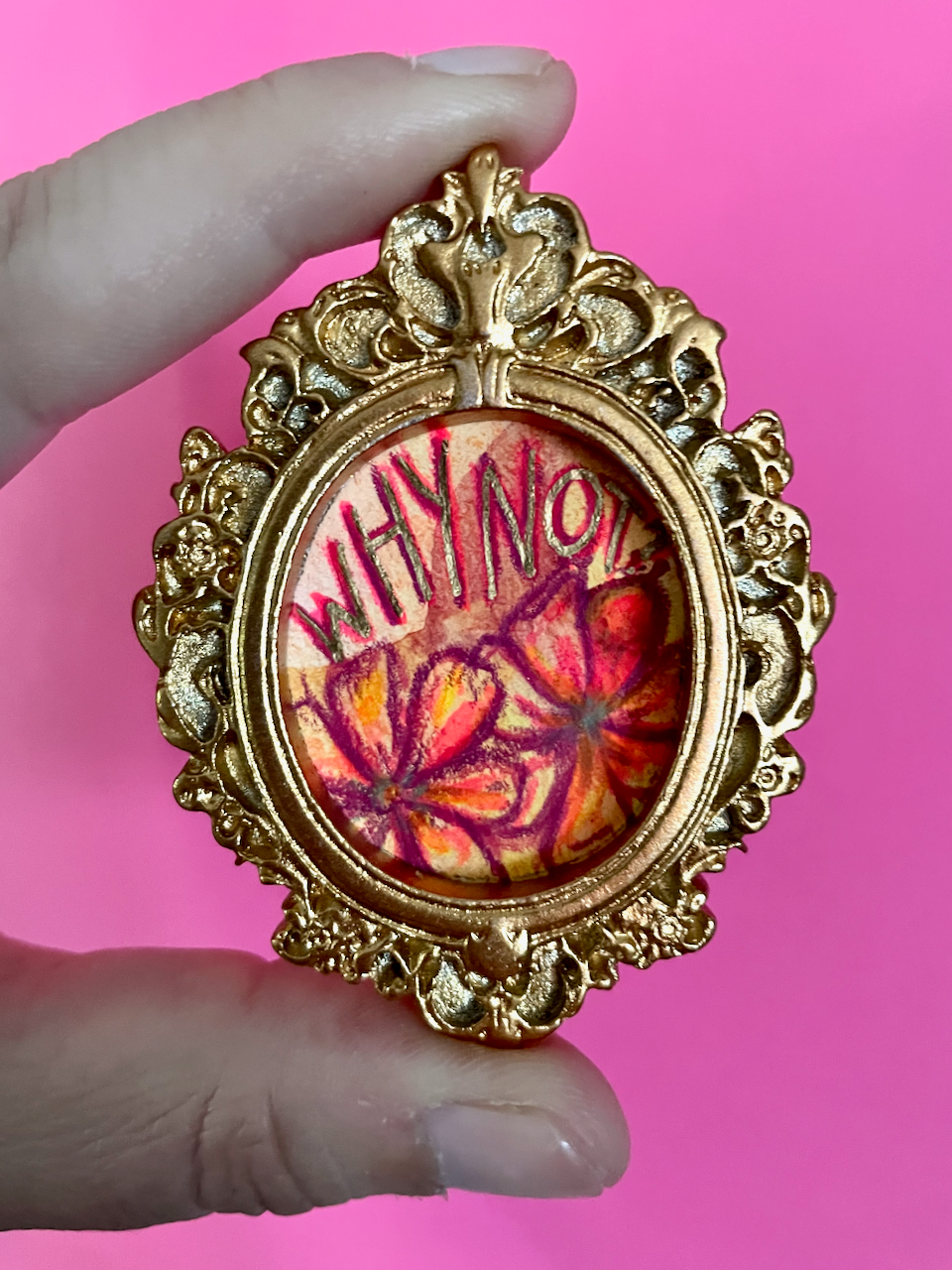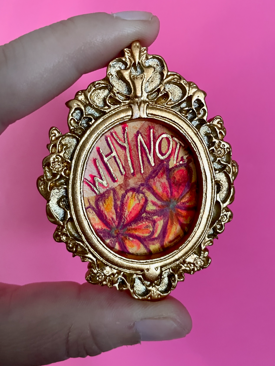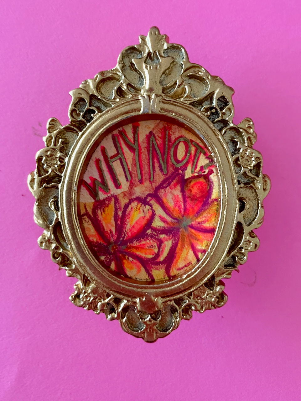 A little watercolor & colored pencil masterpiece, just for your fridge or any magnetic surface. We all need someone to encourage us, and this piece does exactly that -- after all, why not? Each tiny, hand-drawn design features a unique floral motif and a snarky, sweet, or affirming phrase. Set in a hand-cast, ornate, vintage-inspired frame with a strong magnet on the back, this little piece of art is perfect for adding a pop of personality to any magnetic surface.