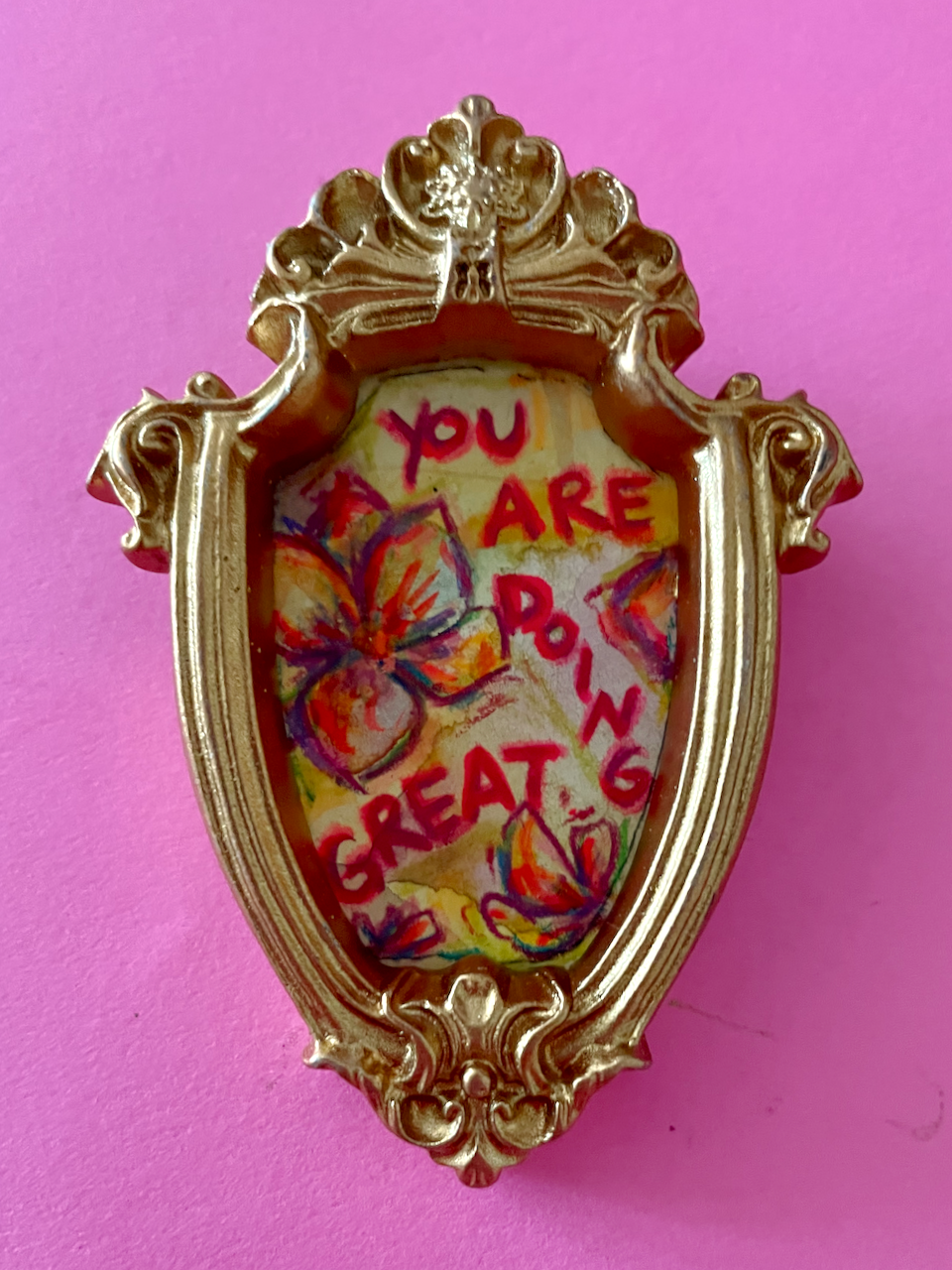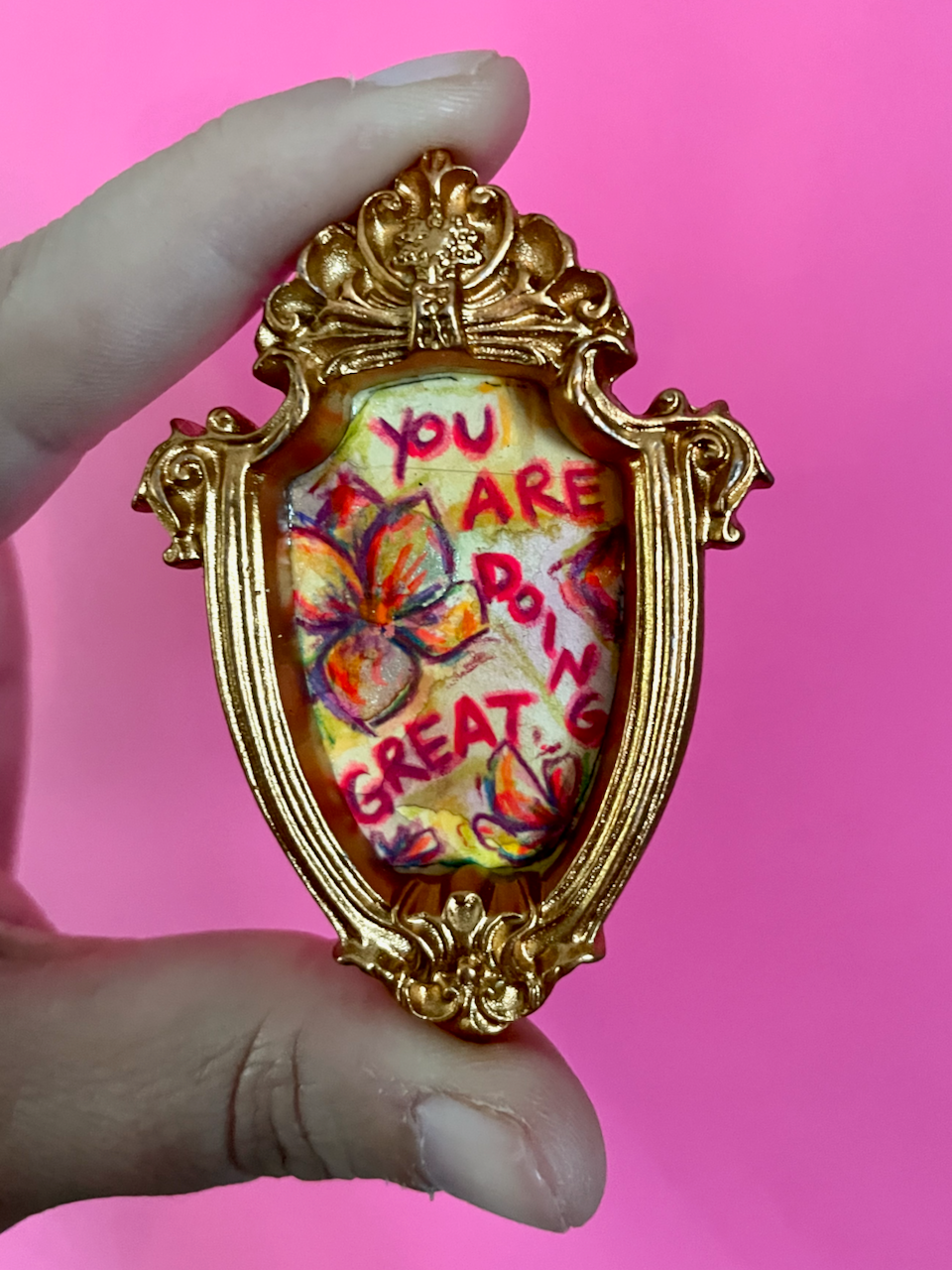 A little watercolor & colored pencil masterpiece, just for your fridge or any magnetic surface. We can all use some encouragement every now and then, and this piece does just that! Each tiny, hand-drawn design features a unique floral motif and a snarky, sweet, or affirming phrase. Set in a hand-cast, ornate, vintage-inspired frame with a strong magnet on the back, this little piece of art is perfect for adding a pop of personality to any magnetic surface.