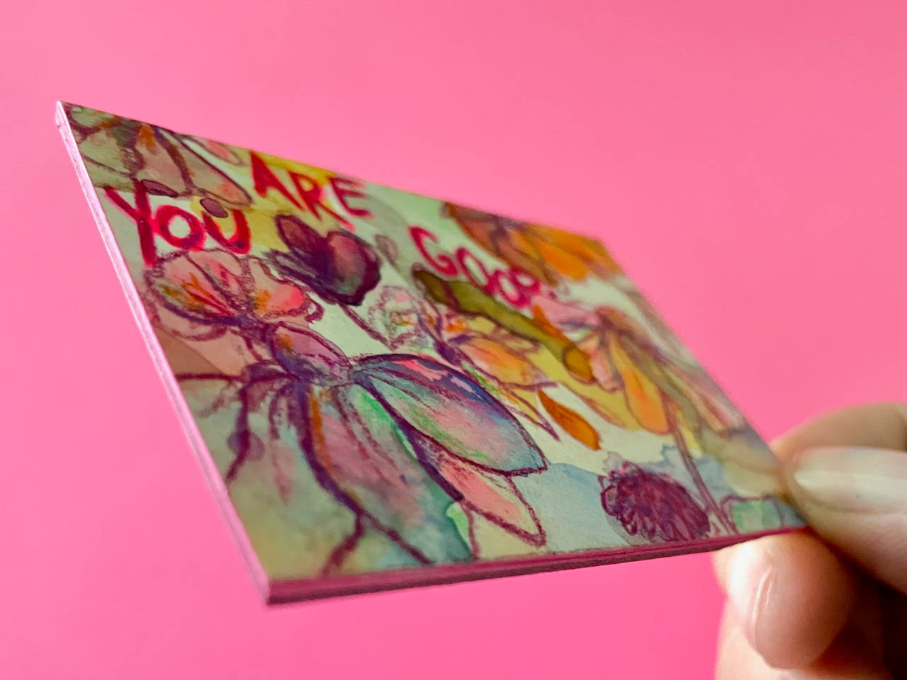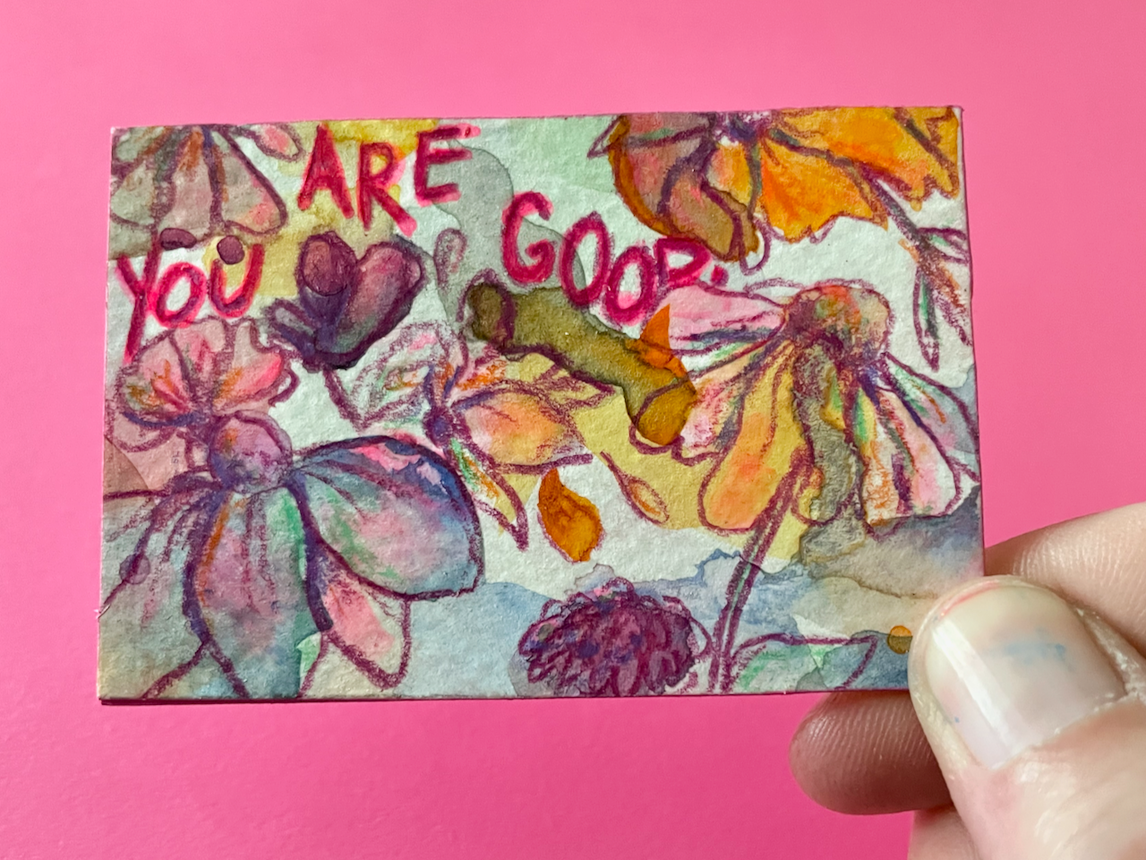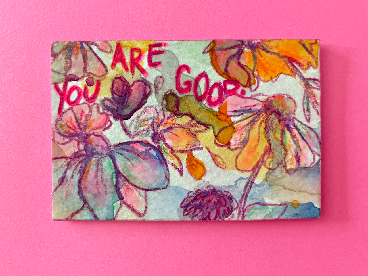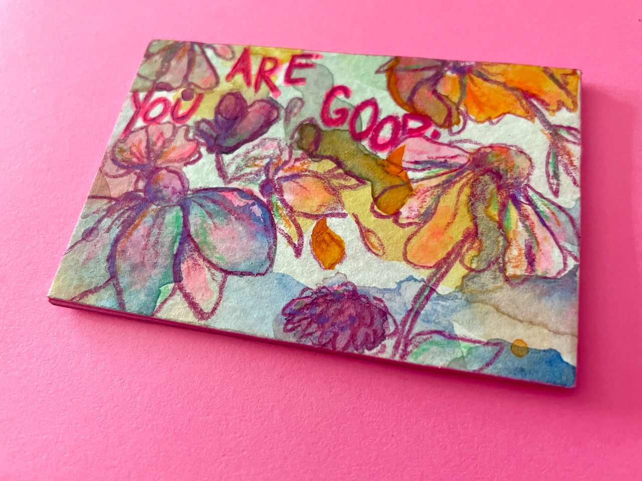 This is a tiny world of color, created with free-flowing watercolor and acrylic backgrounds that feature colored pencil florals and the phrase "You Are Good," because, well, you are.