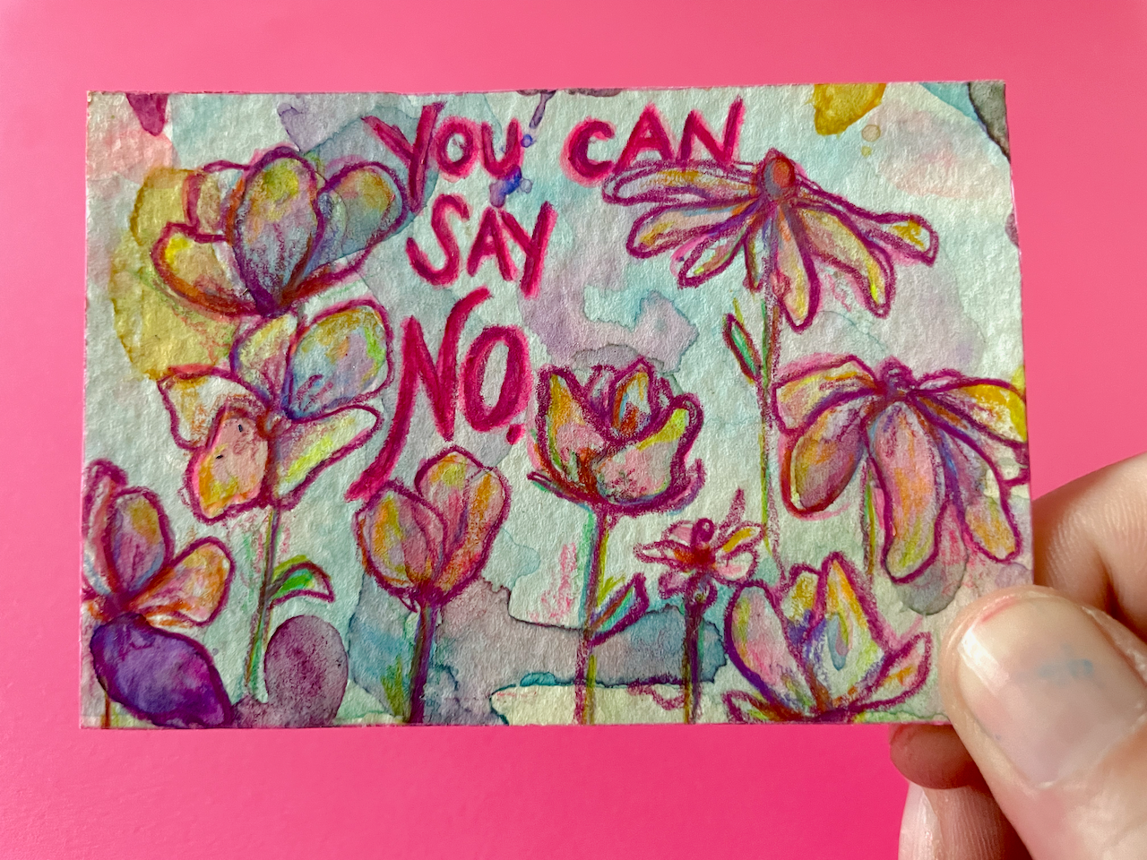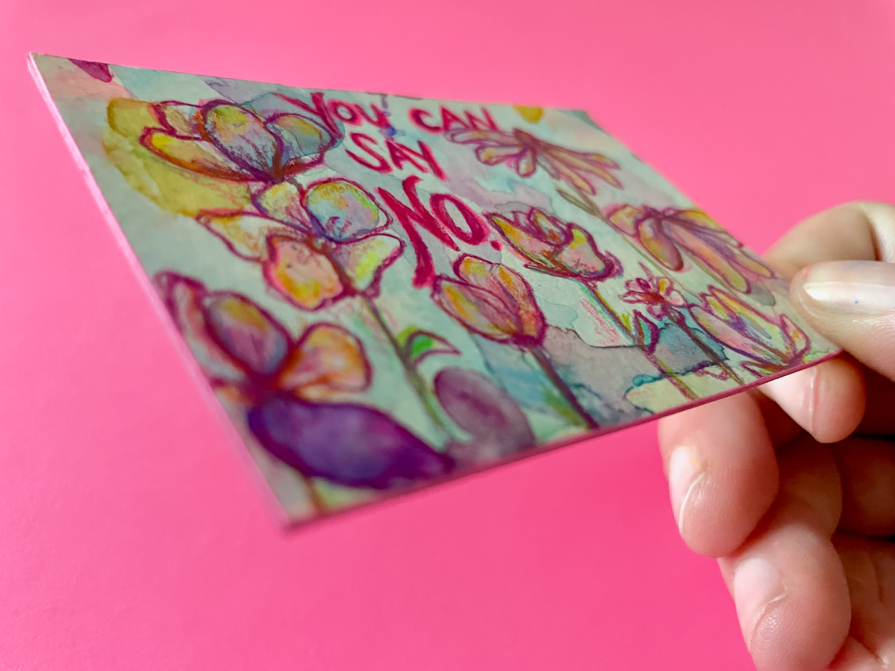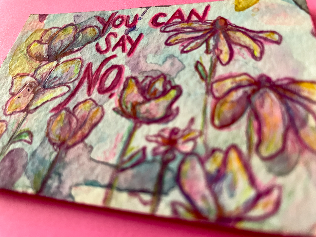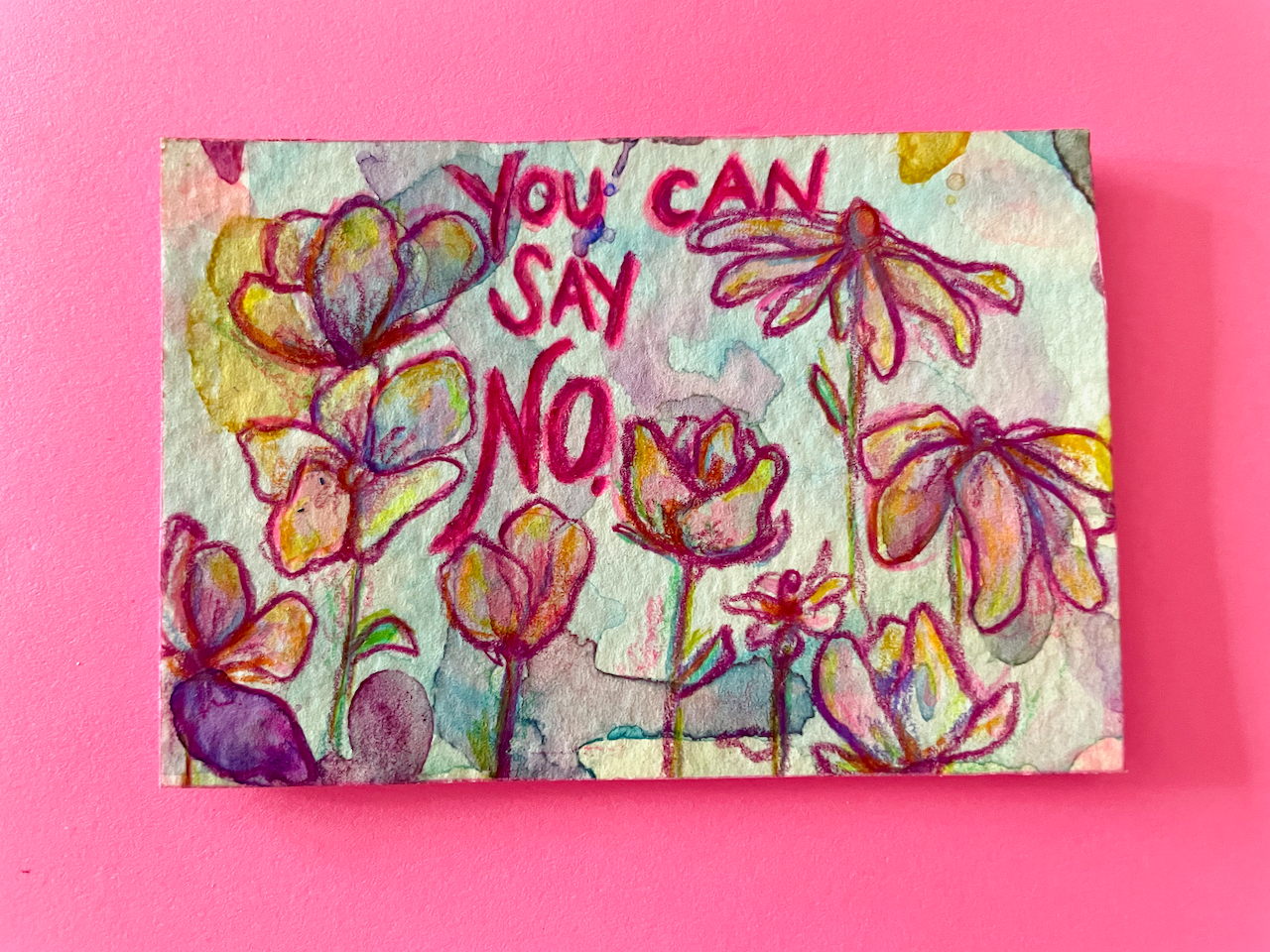 This is a tiny world of color, created with free-flowing watercolor and acrylic backgrounds that feature colored pencil florals and the phrase "You Can Say No" - a reminder that boundaries are allowed and important!