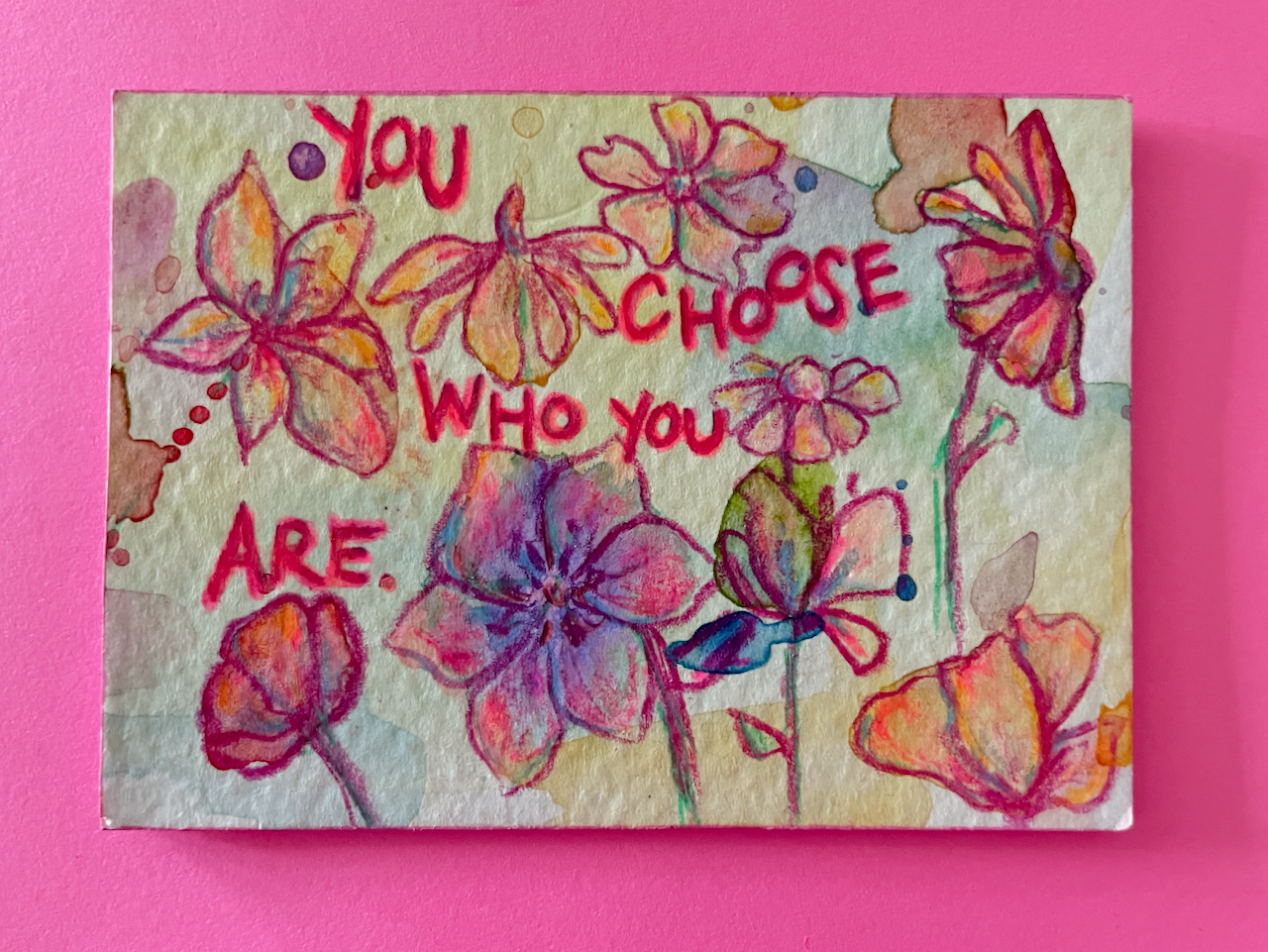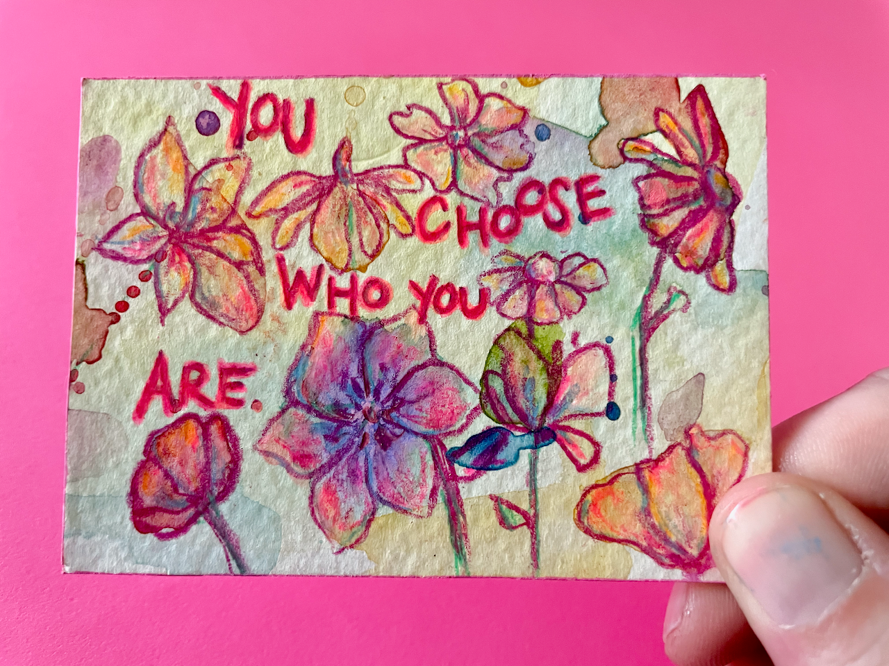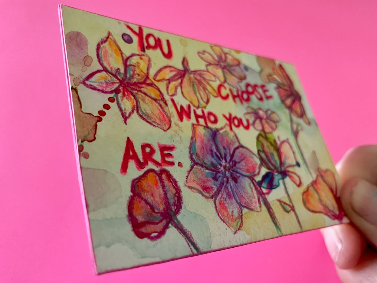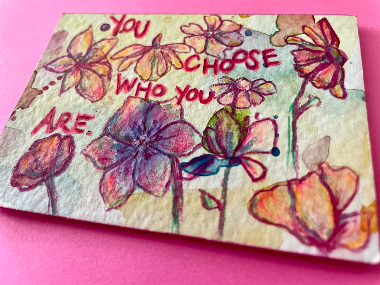 This is a tiny world of color, created with free-flowing watercolor and acrylic backgrounds that feature colored pencil florals and the phrase "You Choose Who You Are," an important reminder that we can be who we choose to be -- not what anyone else says we are.