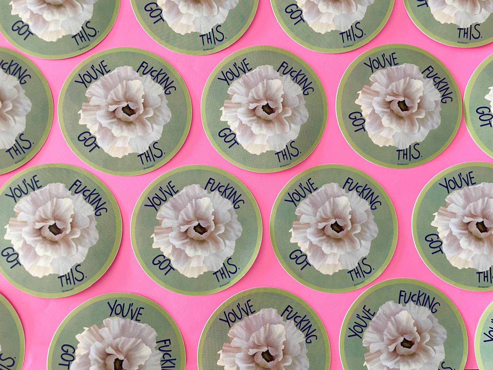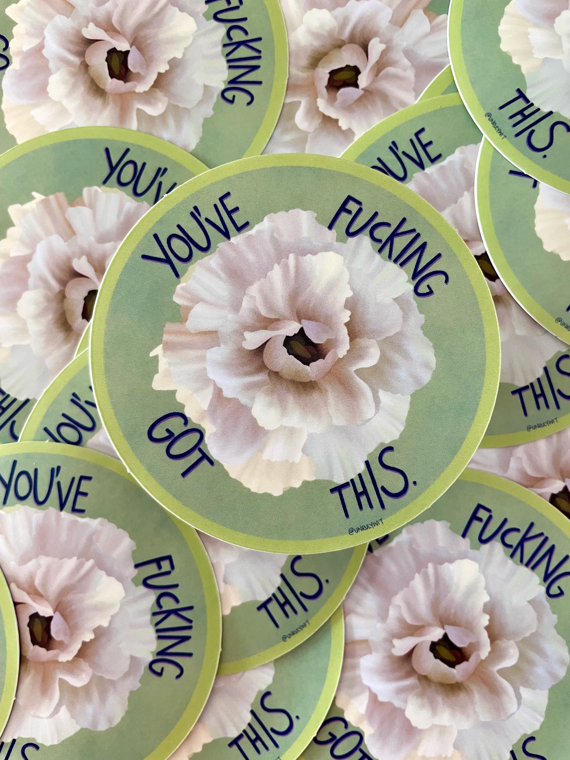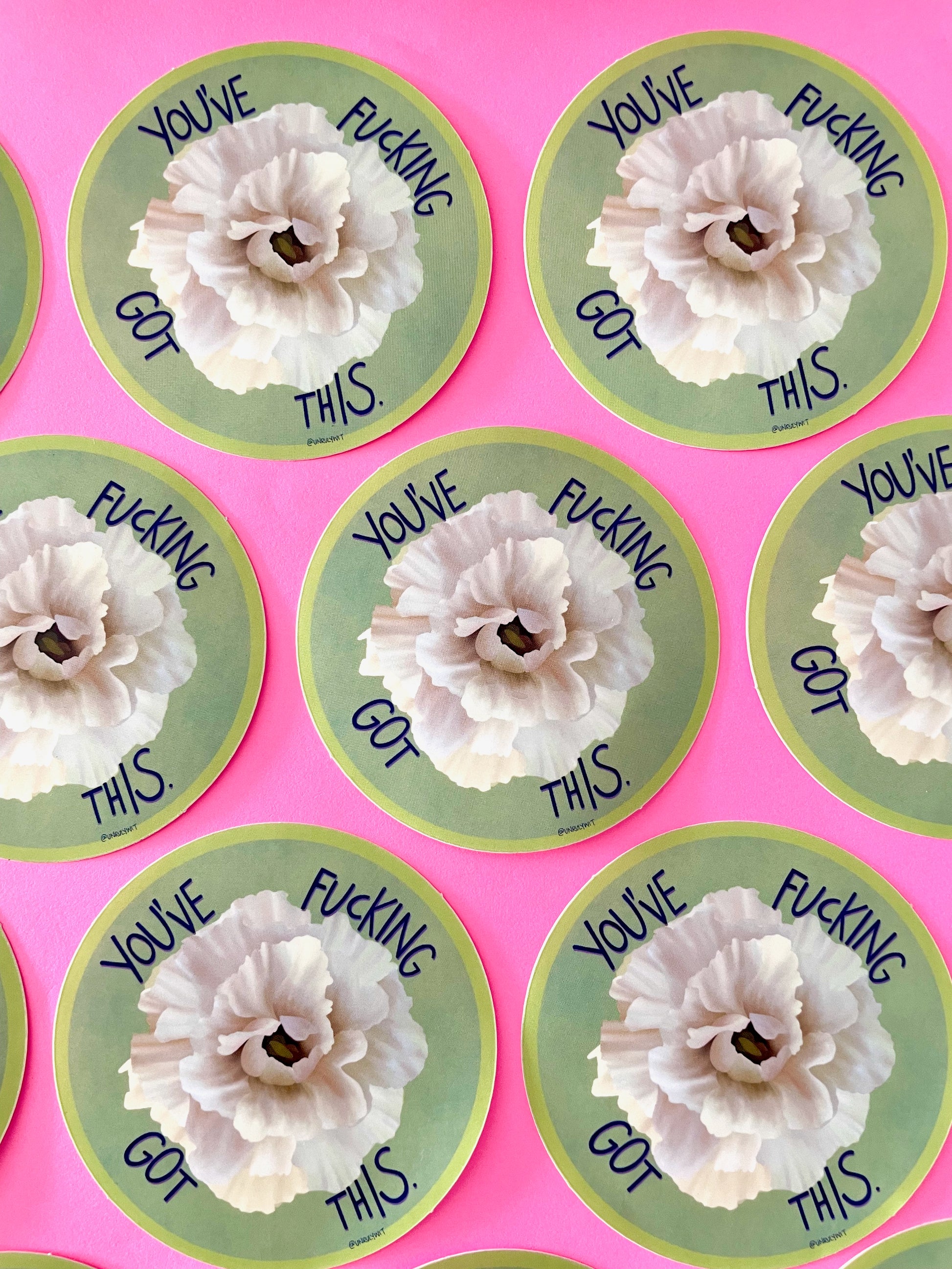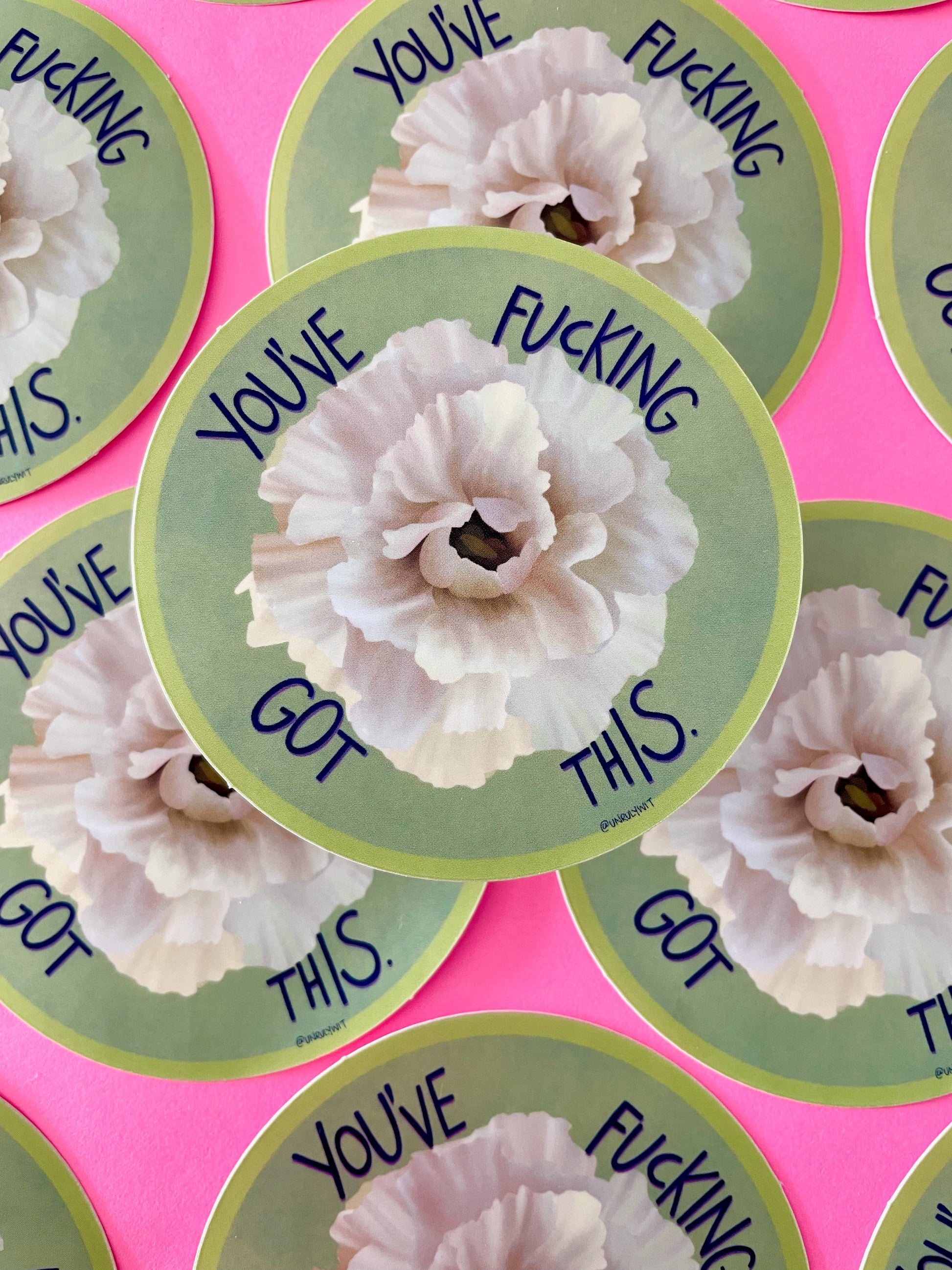 Remind yourself that you're a badass with this waterproof three inch round vinyl sticker. Perfect for any surface, this sticker boasts the encouraging message: You've Fucking Got This.