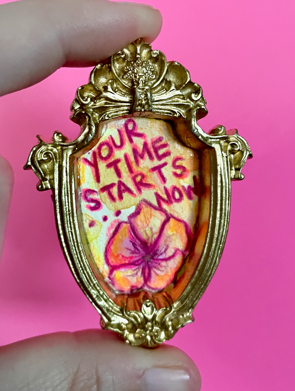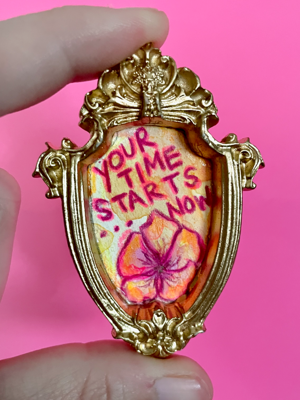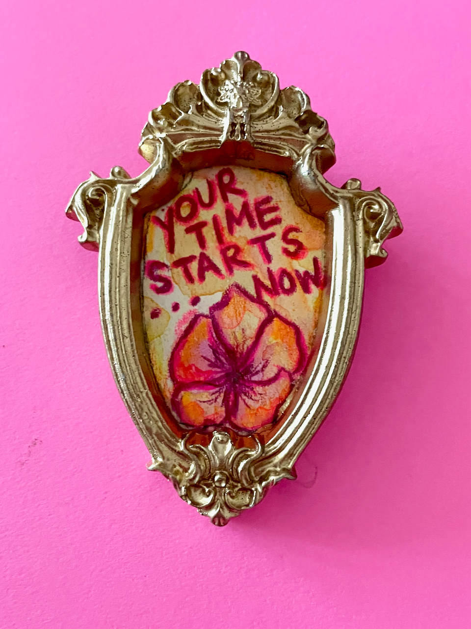 A little watercolor & colored pencil masterpiece, just for your fridge or any magnetic surface. In a nod to one of the greatest television shows (Taskmaster, of course), this reminds you that "Your Time Starts Now." Each tiny, hand-drawn design features a unique floral motif and a snarky, sweet, or affirming phrase. Set in a hand-cast, ornate, vintage-inspired frame with a strong magnet on the back, this little piece of art is perfect for adding a pop of personality to any magnetic surface.