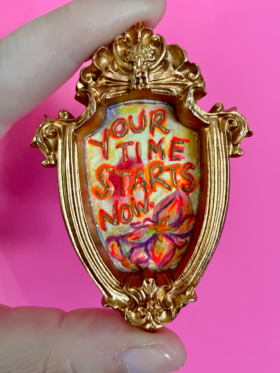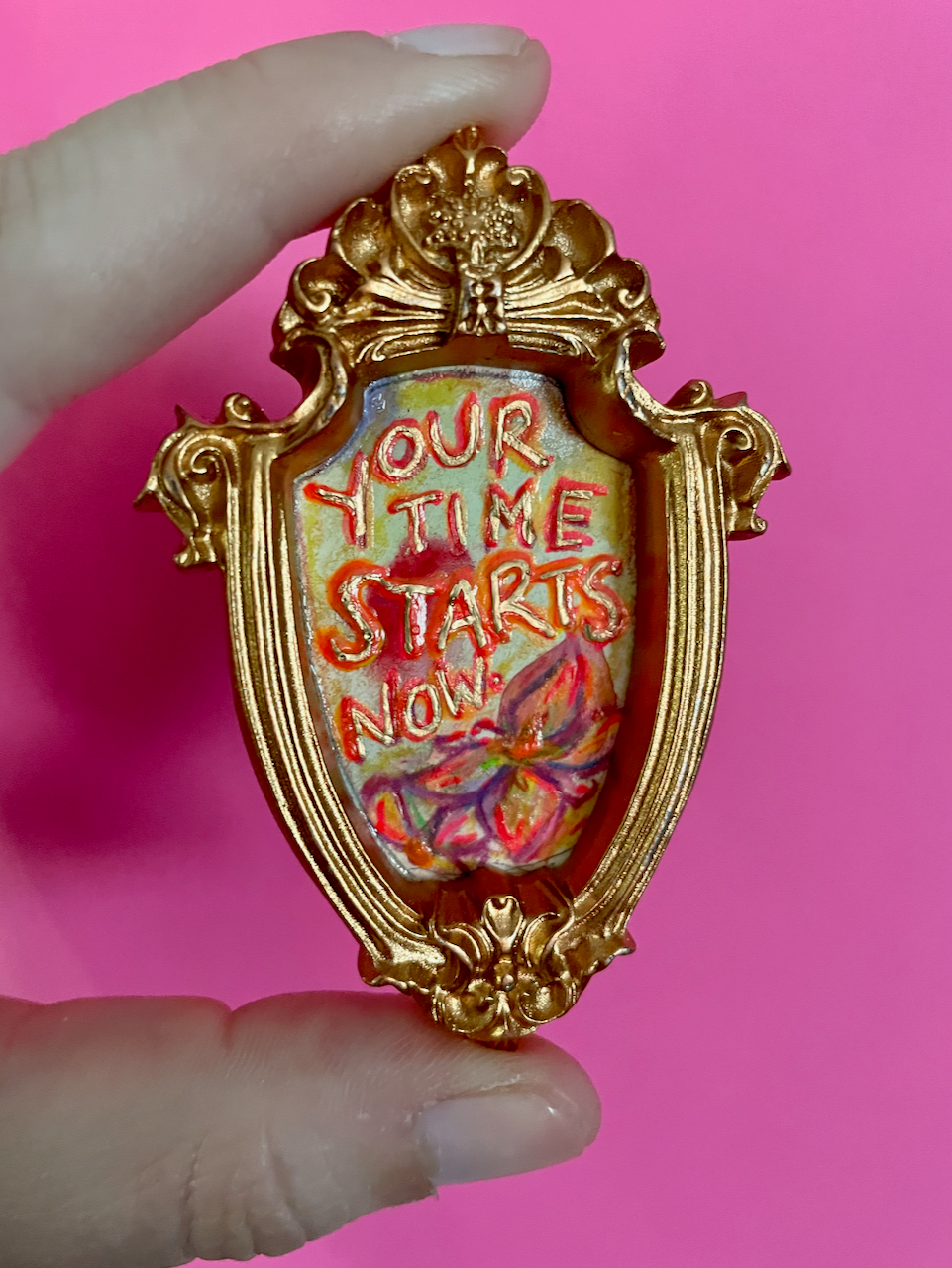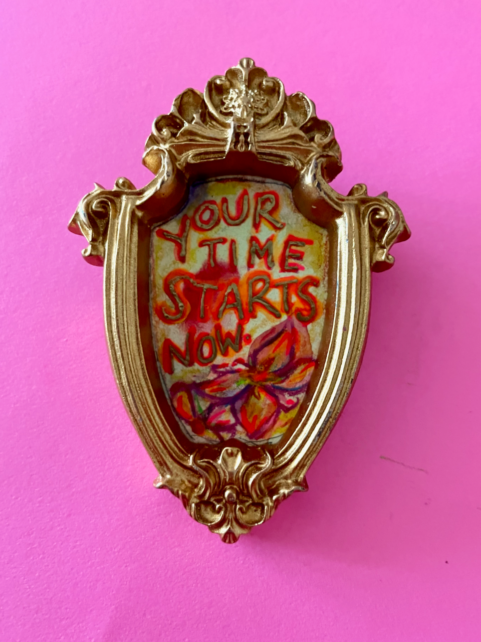 A little watercolor & colored pencil masterpiece, just for your fridge or any magnetic surface. In a nod to one of the greatest television shows (Taskmaster, of course), this reminds you that "Your Time Starts Now." Each tiny, hand-drawn design features a unique floral motif and a snarky, sweet, or affirming phrase. Set in a hand-cast, ornate, vintage-inspired frame with a strong magnet on the back, this little piece of art is perfect for adding a pop of personality to any magnetic surface.